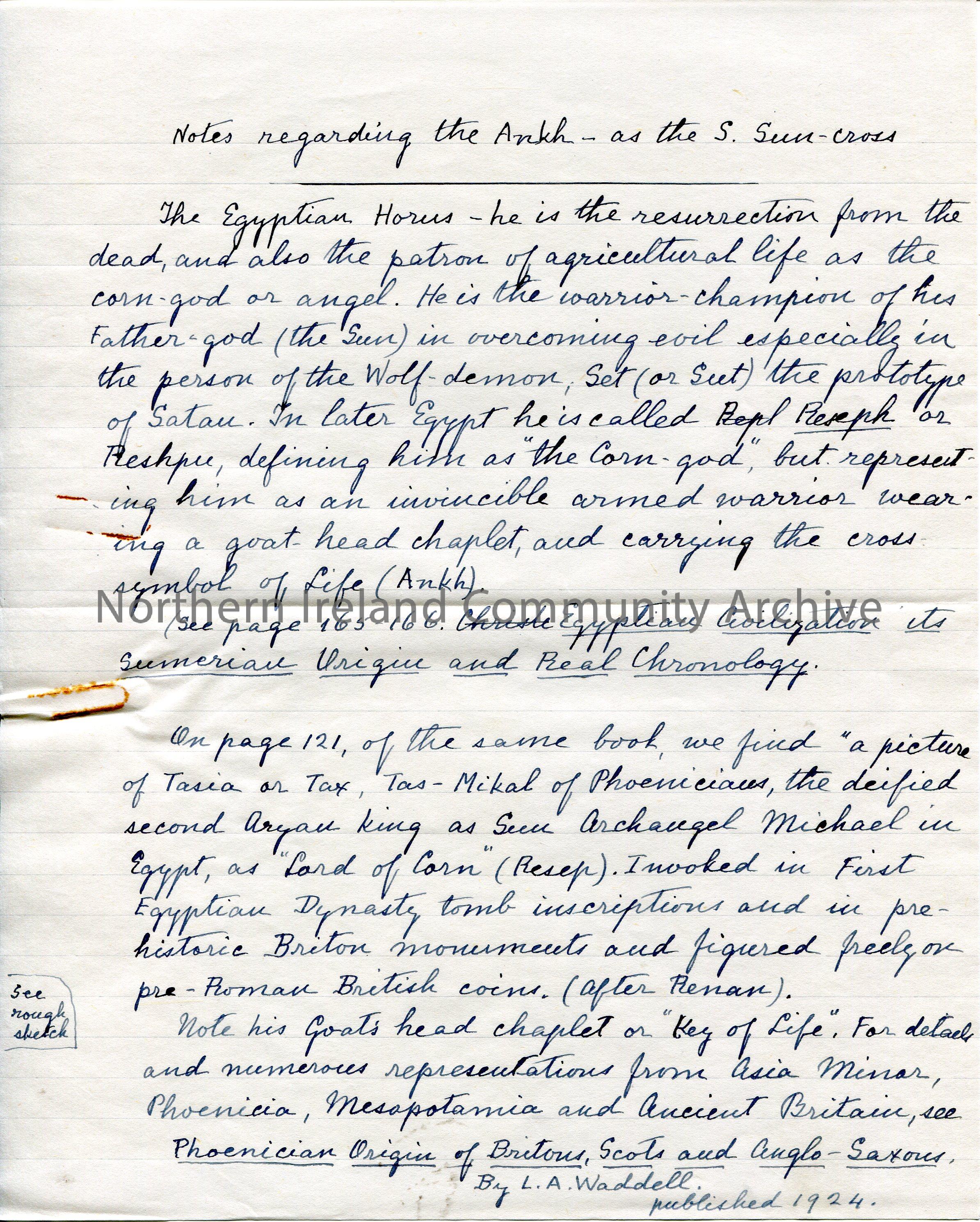 Page 3 of 10. Handwritten notes re 'the Ankh - as the S. Sun cross'. Sent along with handwritten letter and notes taken from book 'Egyptian Civilization its Sumerian Origin and Real Chronology' by L A Waddell. Gave Sam notes in exchange for a lantern slide.