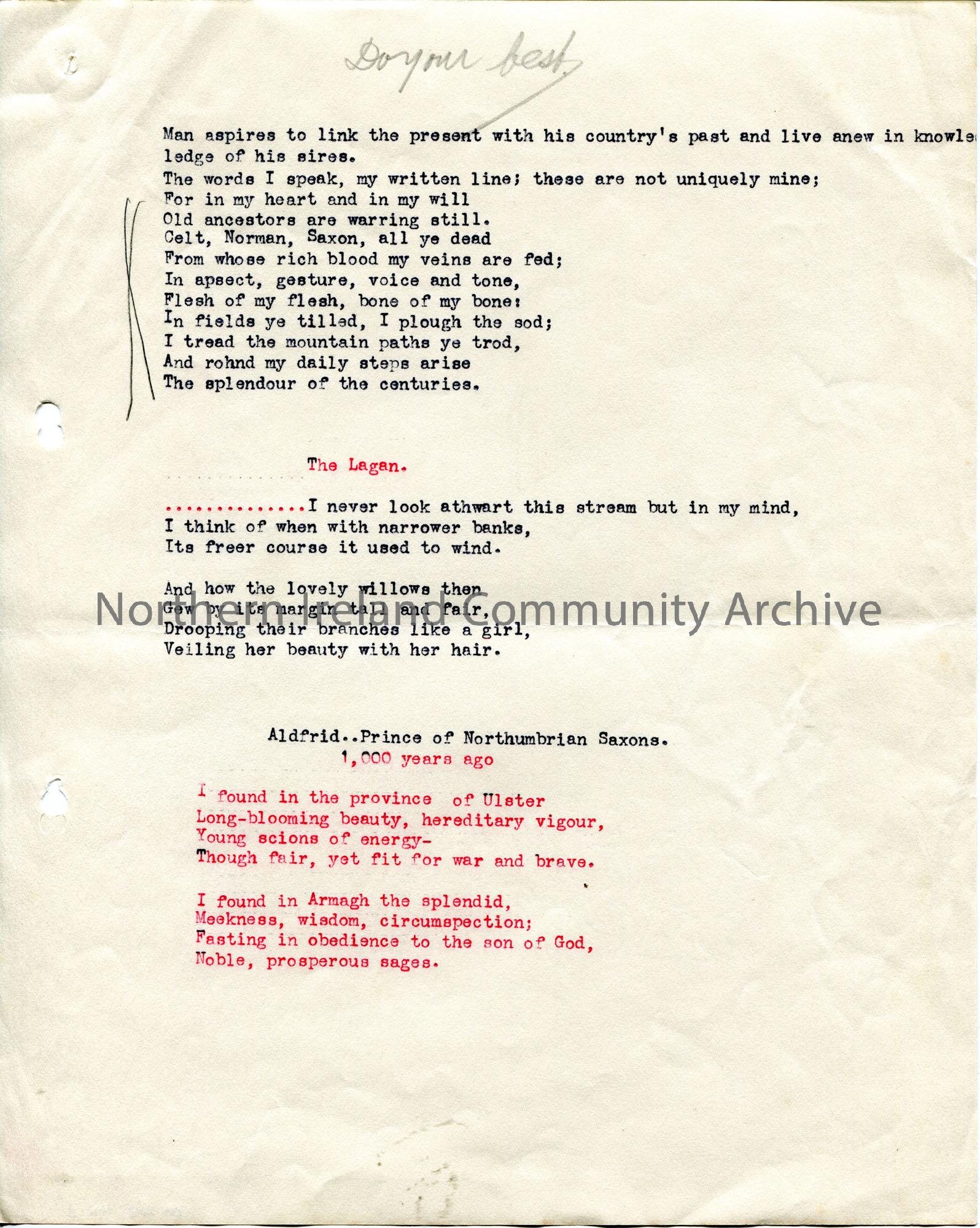 Page 3 of 10. Typed notes for lecture ‘The Glory that was Ulster’ given by Sam Henry at an ‘Old Wolves Conference – Campbell College’ on 2nd August 19…