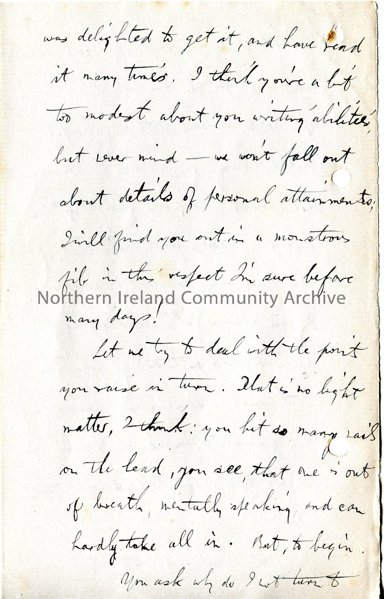 Page 3 of 20 page handwritten letter, on both sides of paper - ends abruptly with no signature - ? last page(s) missing. Discusses his working hours, books he is reading and authors he admires, different types of religion and mysticism, mentions himself as a 'second hand war correspondent' - talks of himself in the second person and his literary aspirations