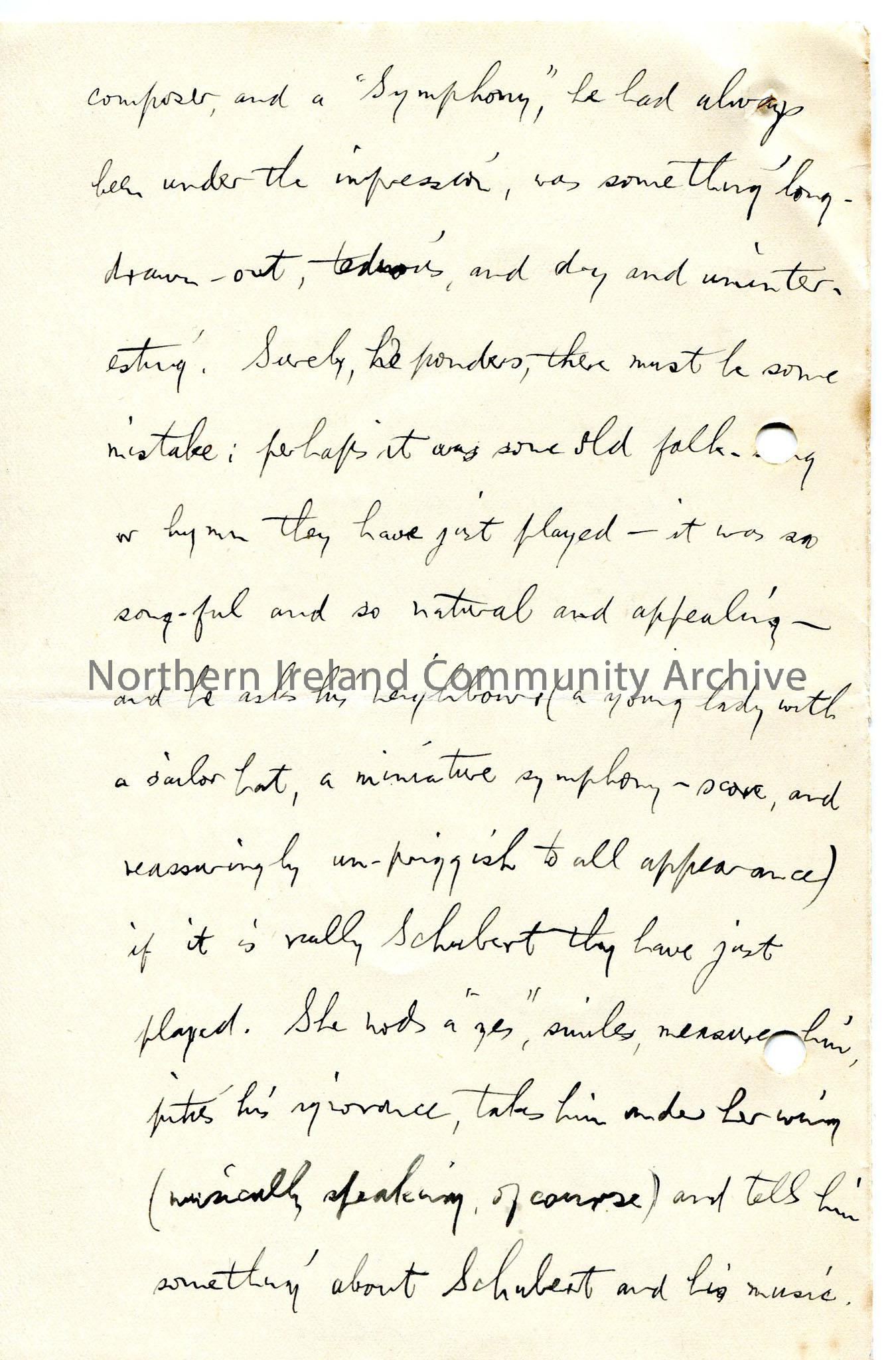 Page 3 of 24 page handwritten letter, on both sides of paper - author appears to have left Coleraine and now live in Glasgow. Mentions Irish Society School. Writes about classical music, Ibsen plays, a fanciful sketch his own, and Irish theatre, writers and myths and legends.