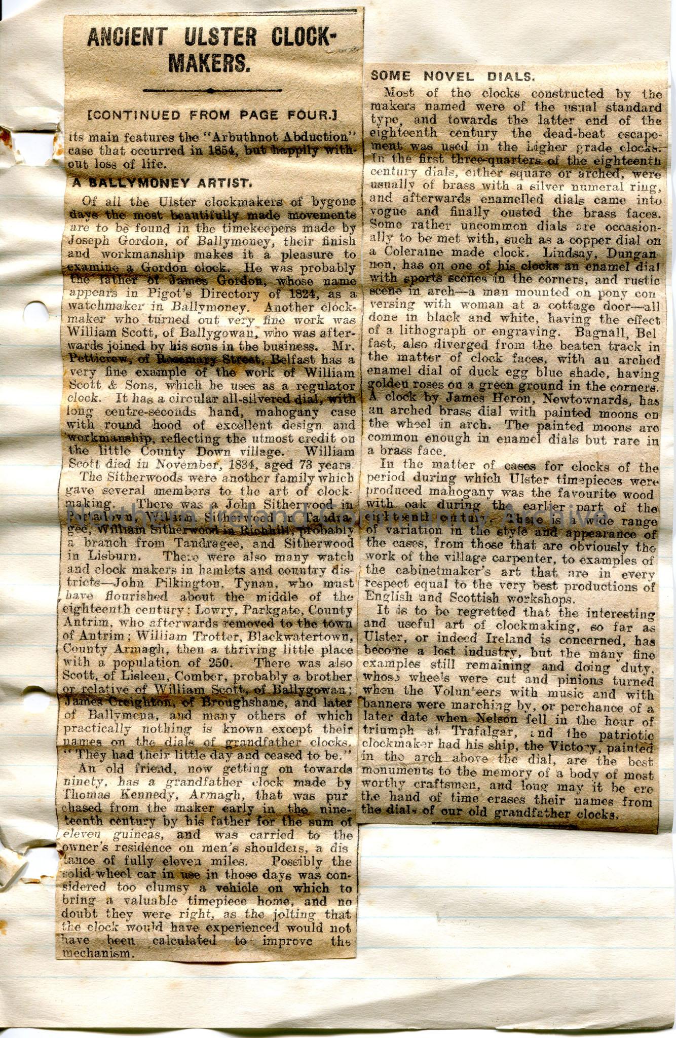 Page 3 of 3. Article cut from newspaper dated Tuesday, 12th February, 1924. 'Whig' written in pencil beside date. Article titled, 'Ancient Ulster Clockmakers. A Templpatrick Romance', by John J. Marshall. Refers to Ulster clockmakers - William Kennedy, Job Rider, John Birnie, Joseph Gordon, and Slitherwoods. Writes of their careers in the industry.