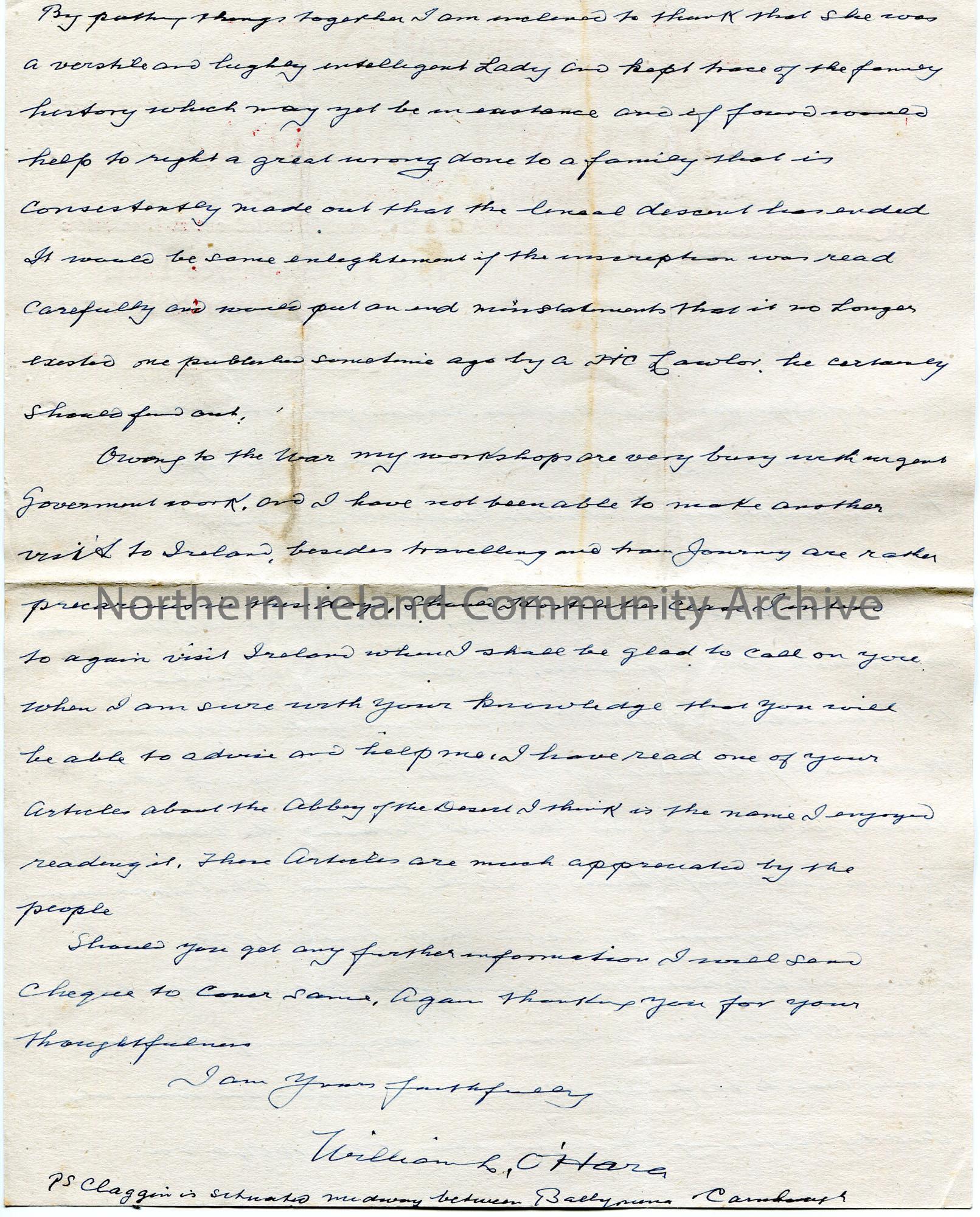 Page 3 of 3. Handwritten letter (double sided) to Sam Henry, Coleraine. Writing re the O’Hara family history. Mentions their previously owned estates … – scan024f