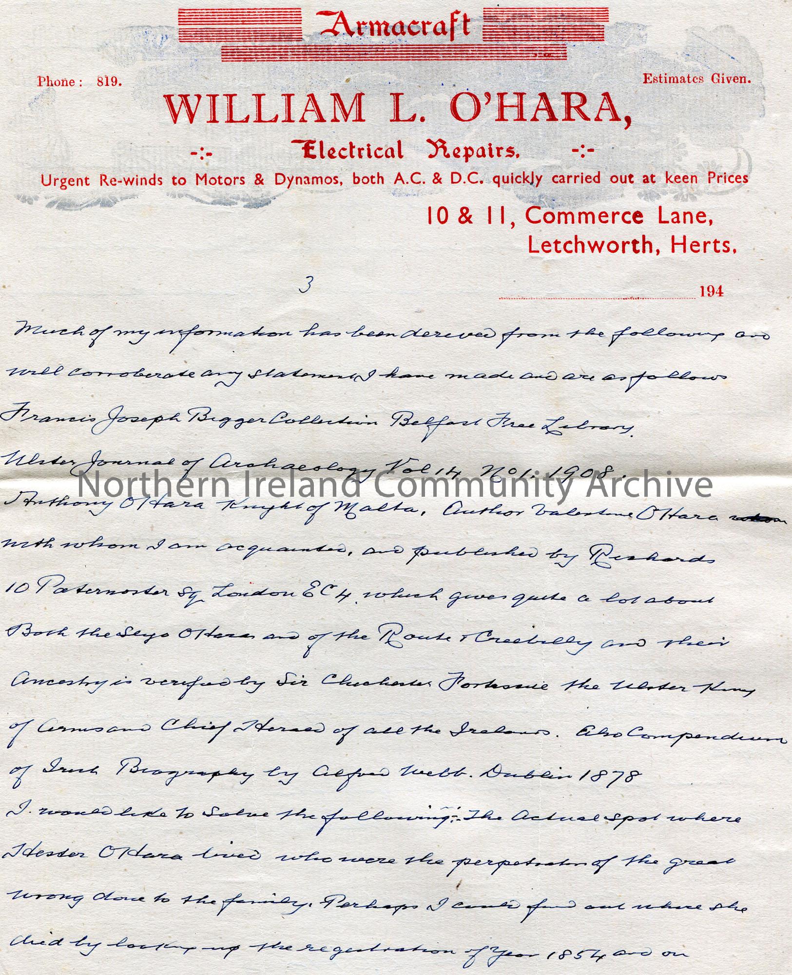 Page 3 of 3. Handwritten letter (double sided) to Sam Henry, Coleraine. Writing re the O’Hara family history. Mentions their previously owned estates …