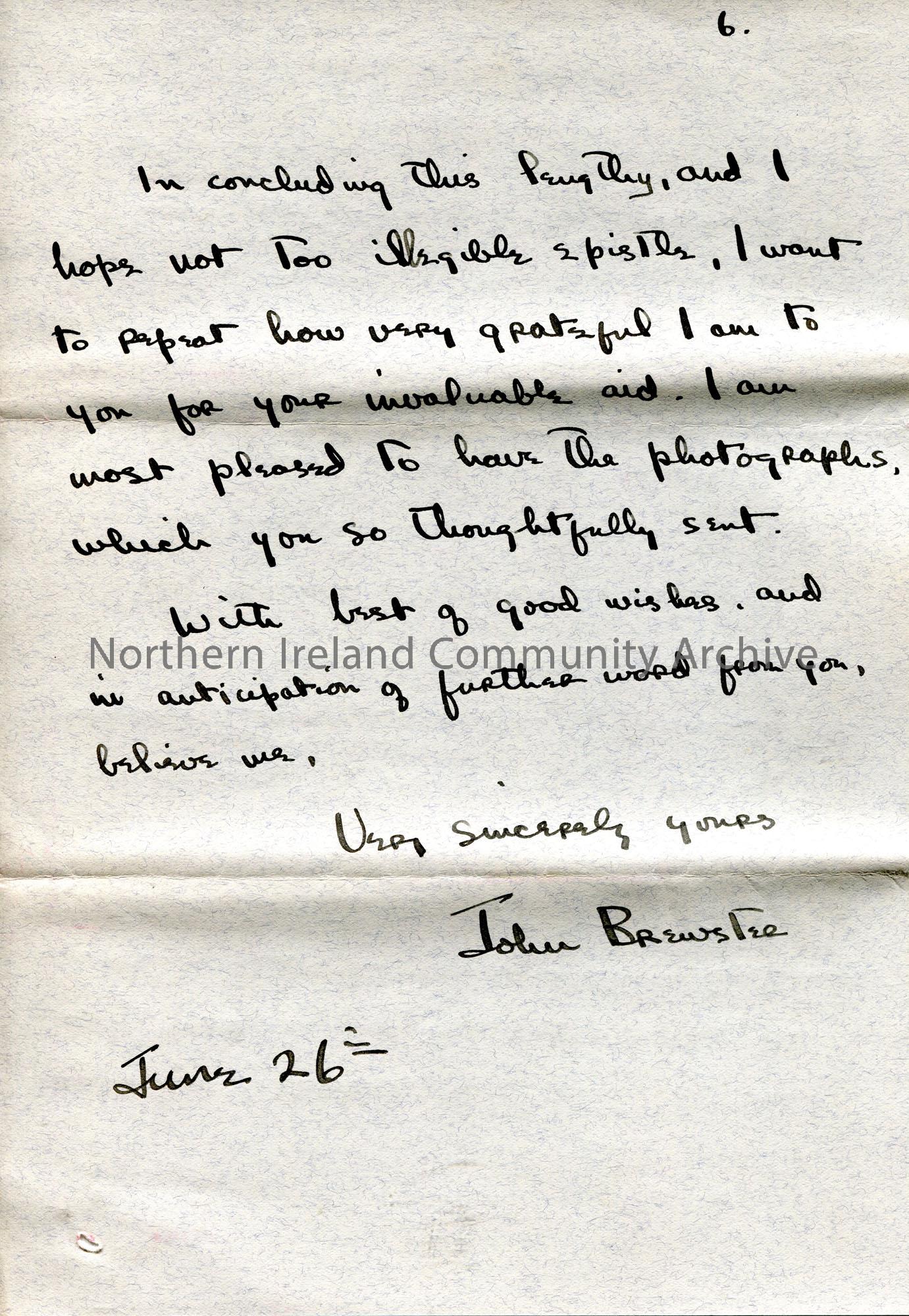 Page 3 of 3. Handwritten letter (double sided) to Sam Henry from John Brewster. Writes of his great appreciation to Sam for his research into the Brew… – scan013f