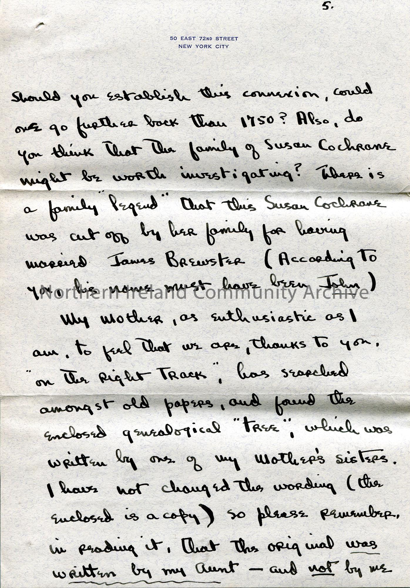 Page 3 of 3. Handwritten letter (double sided) to Sam Henry from John Brewster. Writes of his great appreciation to Sam for his research into the Brewster family and encloses fee of ten dollars. Asks Sam to carry out further research for an additional twenty-five dollars.
