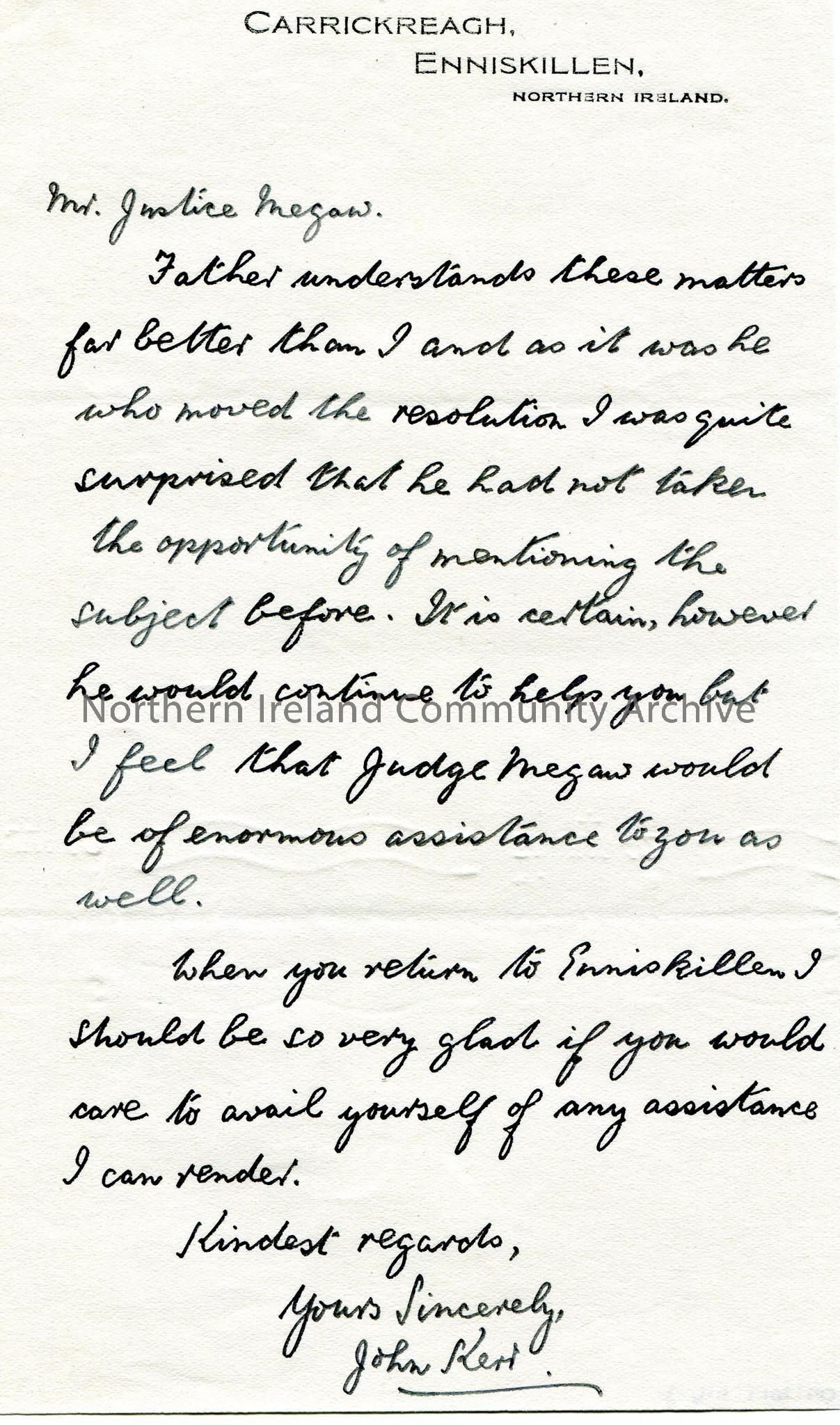 Page 3 of 3. Handwritten letter to Mr Henry. Writes re the passing of a resolution 'welcoming our kinsmen from across the Ocean'. Refers to the Spring Assizes and the Grand Jury of Fermanagh, Sir Edward Archdale, President Roosevelt, Mr Justice Megaw, Colonel Everest at Ely Lodge. Informs Sam that his father moved the resolution. Suggests Sam contact Justice Megaw for information.