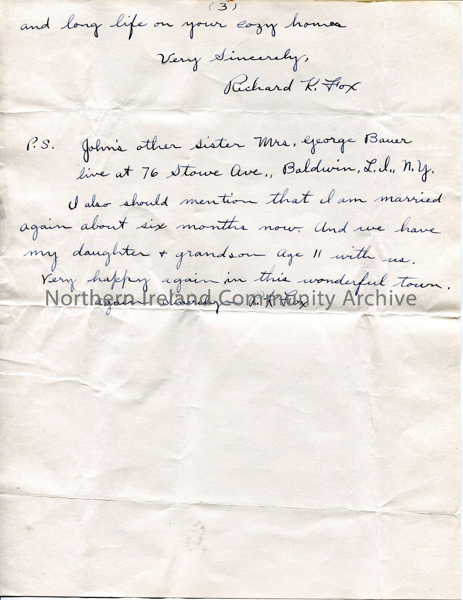 Page 3 of 3. Handwritten letter to Sam Henry. Writing re the death of John A. Martin who appears to have died. He lived in America but appears to have visited Northern Ireland before.