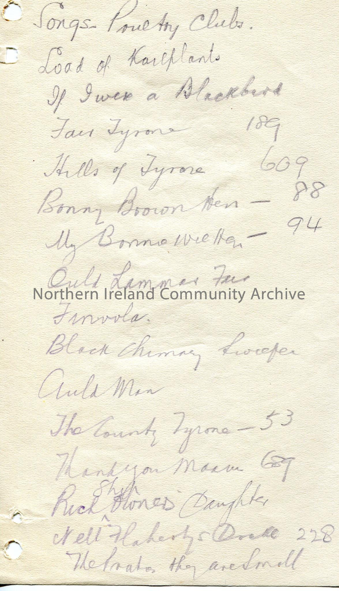 Page 3 of 3. Handwritten list of songs for lecture.