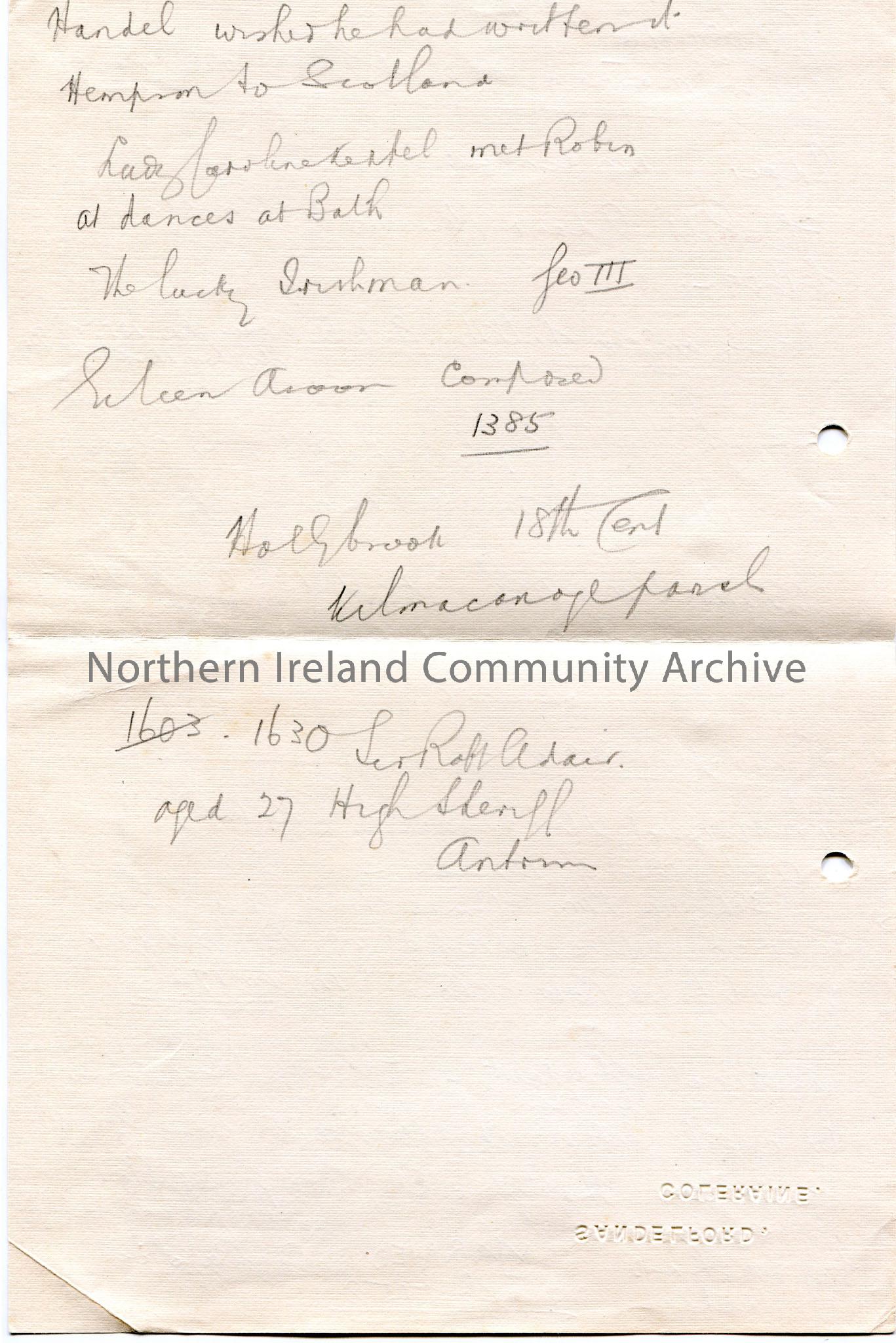 Page 3 of 3. Handwritten notes in pencil re Dublin broadcast re Robin Adair. Mentions Eileen Aroon, Caroline Kepple, Sir Robert Adair, Burke, Sir Walt…