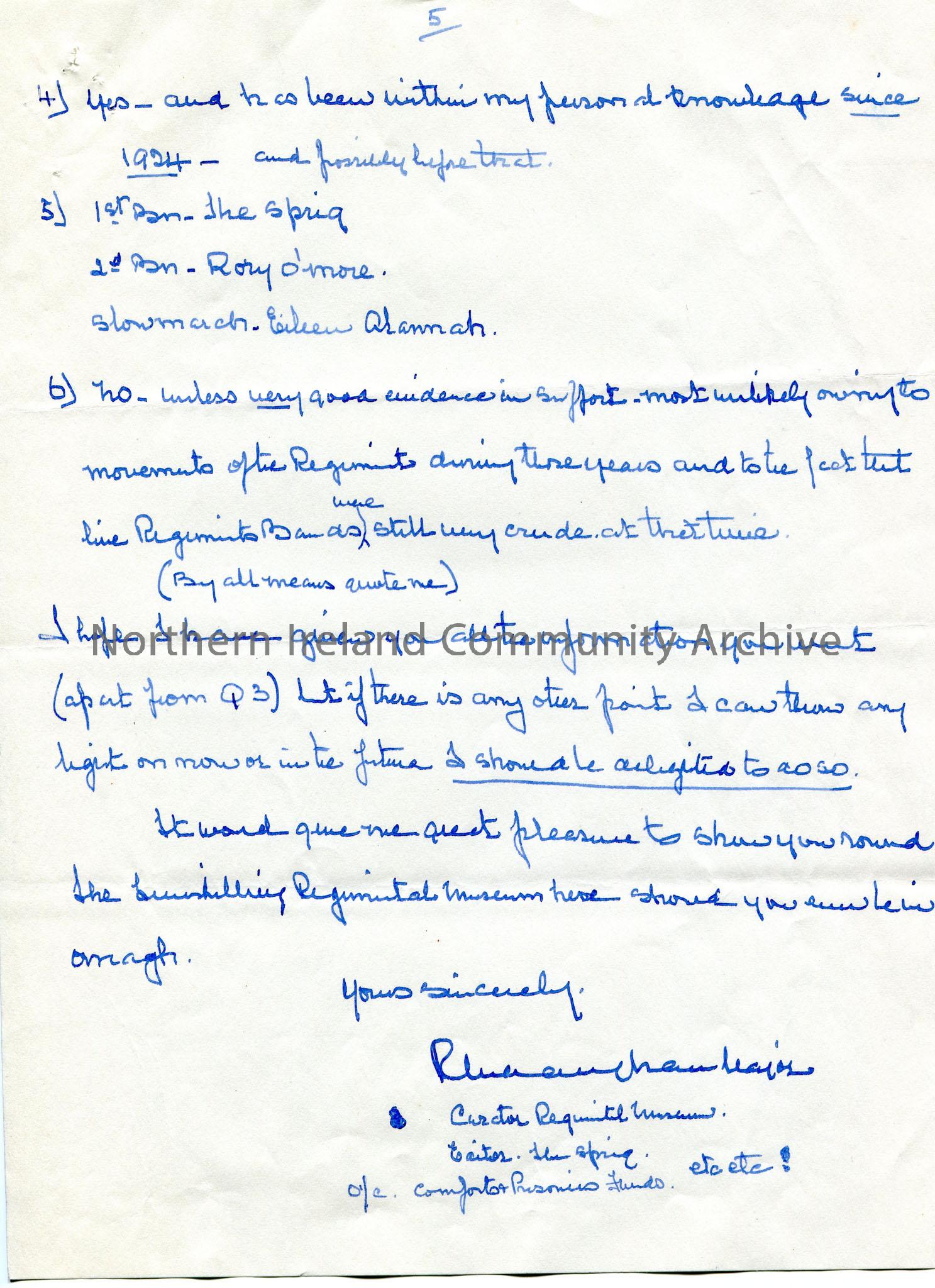 Page 3 of 3 of a handwritten letter, double sided, to Mr Henry. Writing re Sam's enquiries into the origin of the song 'The Star Spangled Banner'. Encloses article from the Belfast Telegraph on the topic. Answers questions asked by Sam on the song's connections to the Royal Inniskilling Fusiliers.