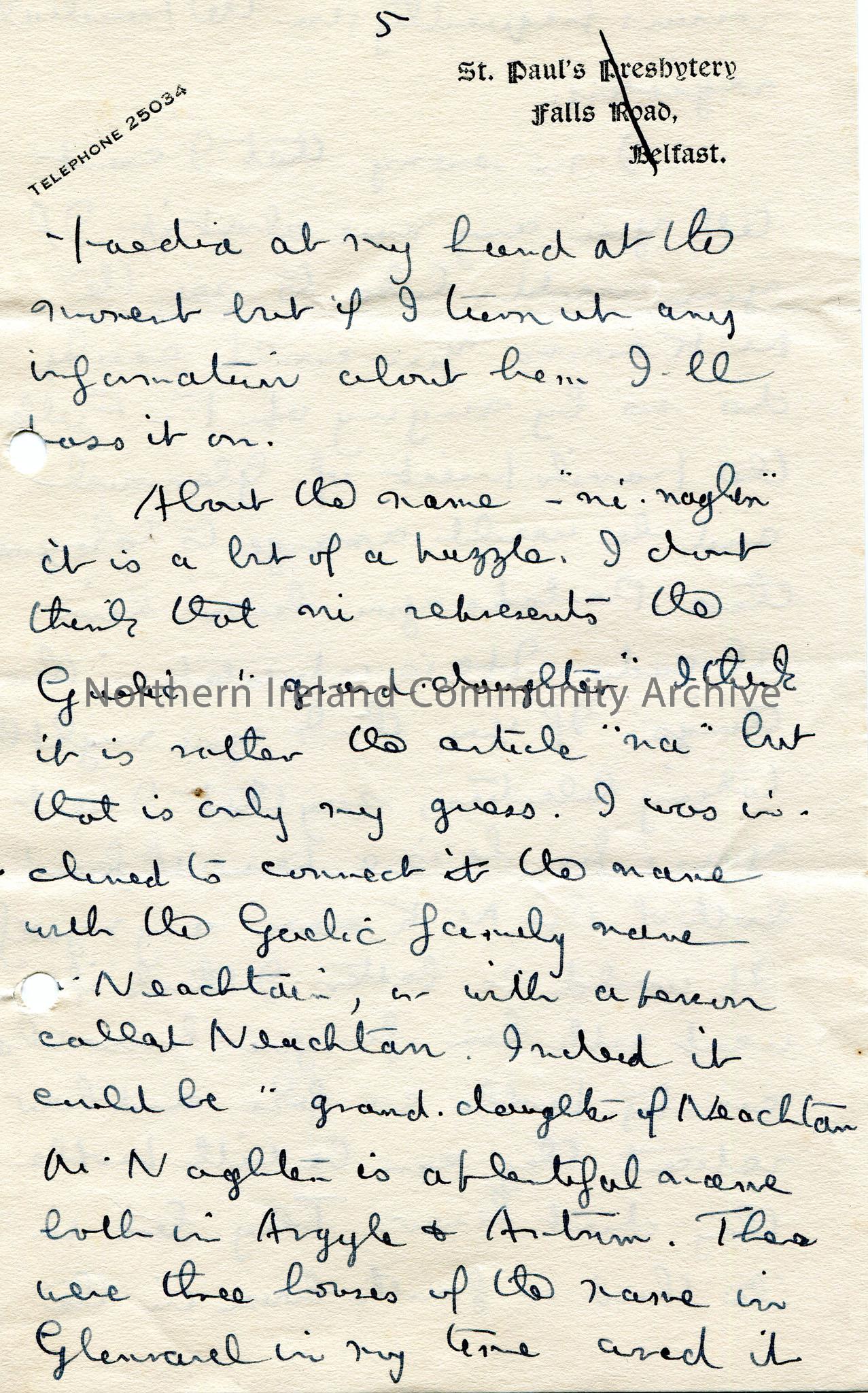 Page 3 of 3 of handwritten letter, double sided, to Sam Henry. Writing re Sam's query about a cross and its location. Discussion of its location in Glenravel. Also refers to Bishop McDonald? Discusses the gaelic name 'ne naghen' and its origins.