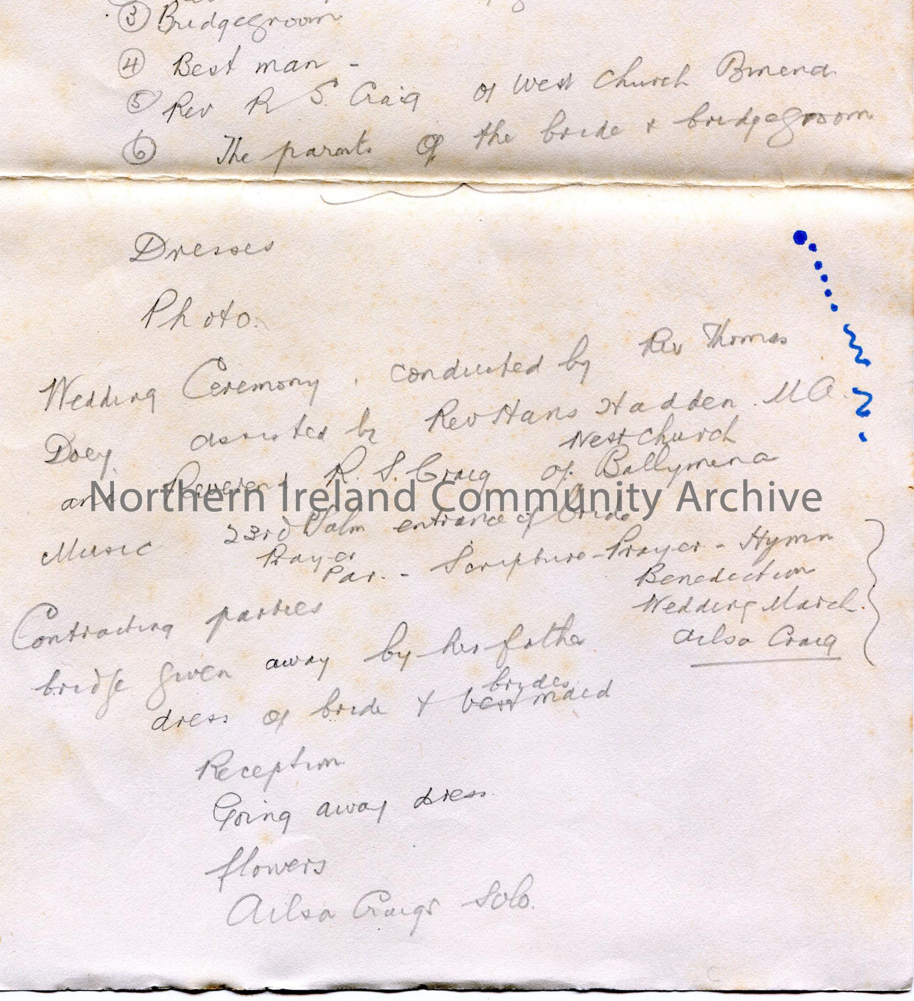 Page 3 of 3 of handwritten notes in pencil re the marriage of Sam Henry’s daughter Miss Olive Henry and Mr William Aubrey Craig, Ingledene, Kilrea. Th… – img016e
