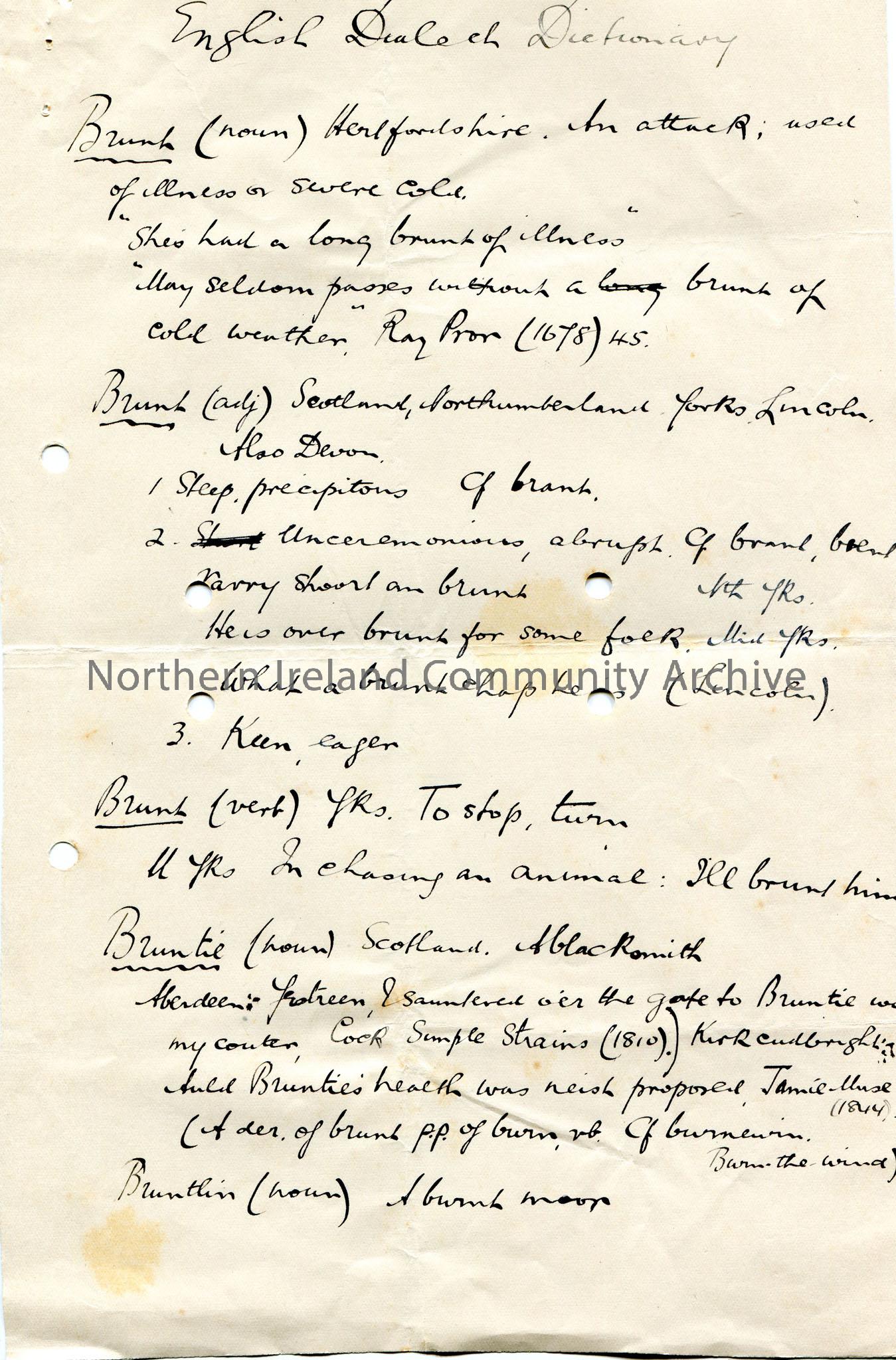Page 3 of 3 of handwritten notes re words and definitions from the New English Dictionary. Notes the name of a book for searching births, deaths and marriages in Ireland by Robert E Matheson? Refers to the Bronte name. Other words and definitions from English Dialect Dictionary.