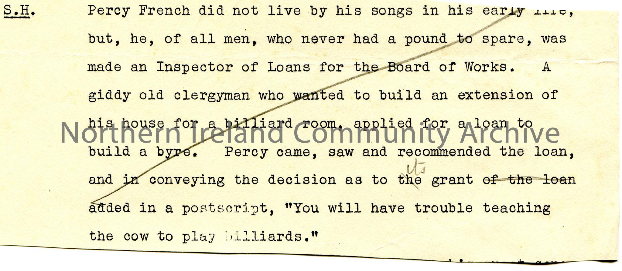 Page 3 of 3 of parts of a rough typed script for broadcast re Percy French. Annotated in pencil.