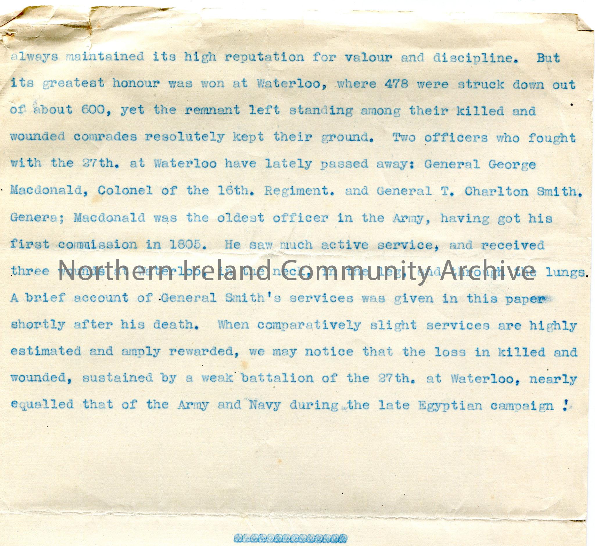 Page 3 of 3 of typed extract titled, 'The Enniskillen Regiments of Horse and Foot'. Extract from the Army and Navy Gazette, 18th August, 1883 from the MS Record of Services of the 27th Inniskillings preserved in the Regimental Museum. An early history of the Royal Inniskilling Fusiliers 1600-1800.