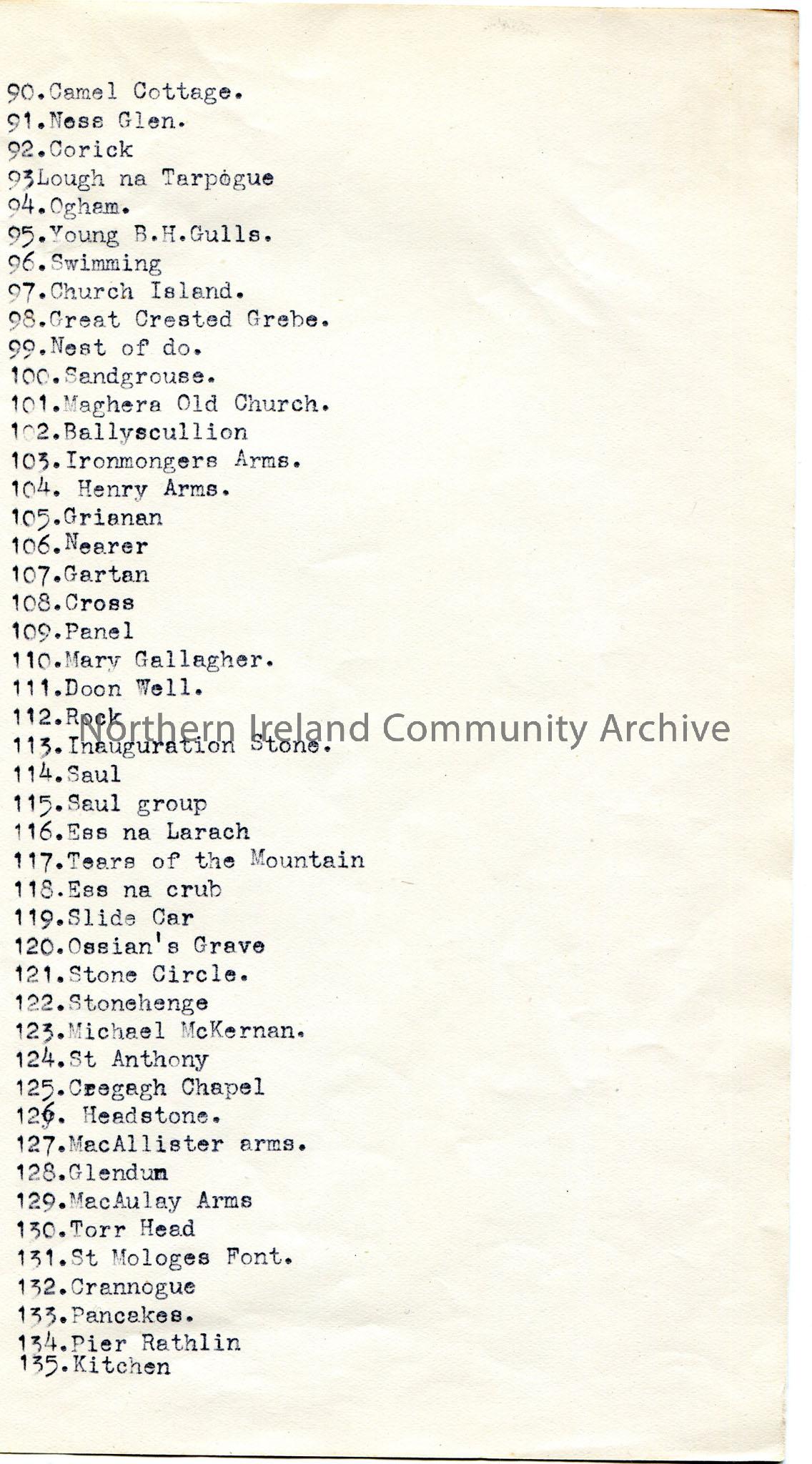 Page 3 of 3 of typed list of names of 135 slides for lecture. Titled, ‘Route N.F.C. A Summer’s Gleanings..27th Jan 1933 Cafe Coleraine’. The names of …