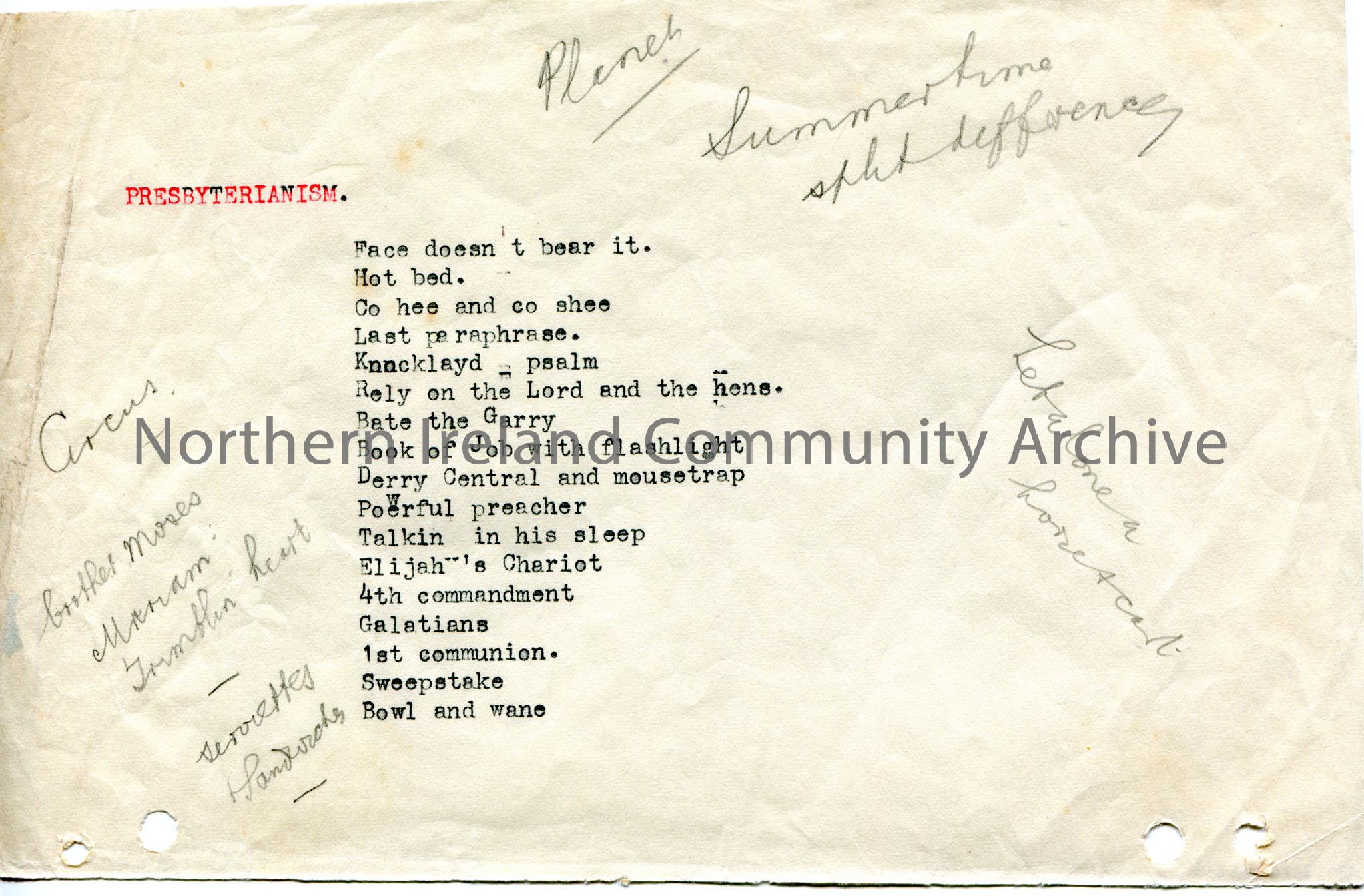 Page 3 of 3 of typed notes re lecture titled, 'An Hour of Story and Song' at First Coleraine on 31st January, 1935. This page has a list of various topics under the heading 'Presbyterianism'. There are handwritten words in pencil also on the page. Page is smaller and looks to have been cut from a larger page.