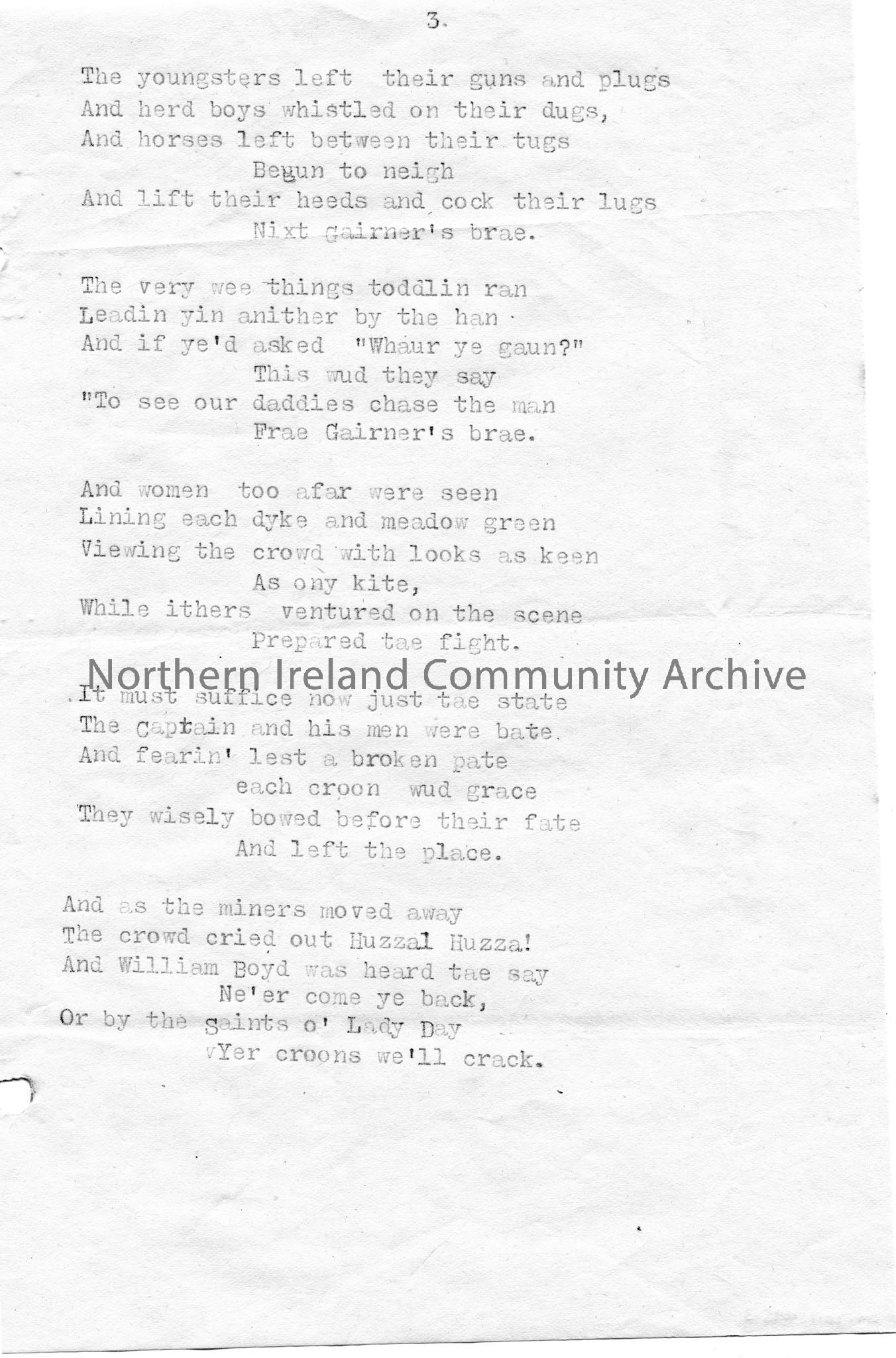 Page 3 of 3 of typed poem or words to song titled, ‘The Iron Ore Riots’. 17 verses. Mentions Tam Garnier [Gardiner].
