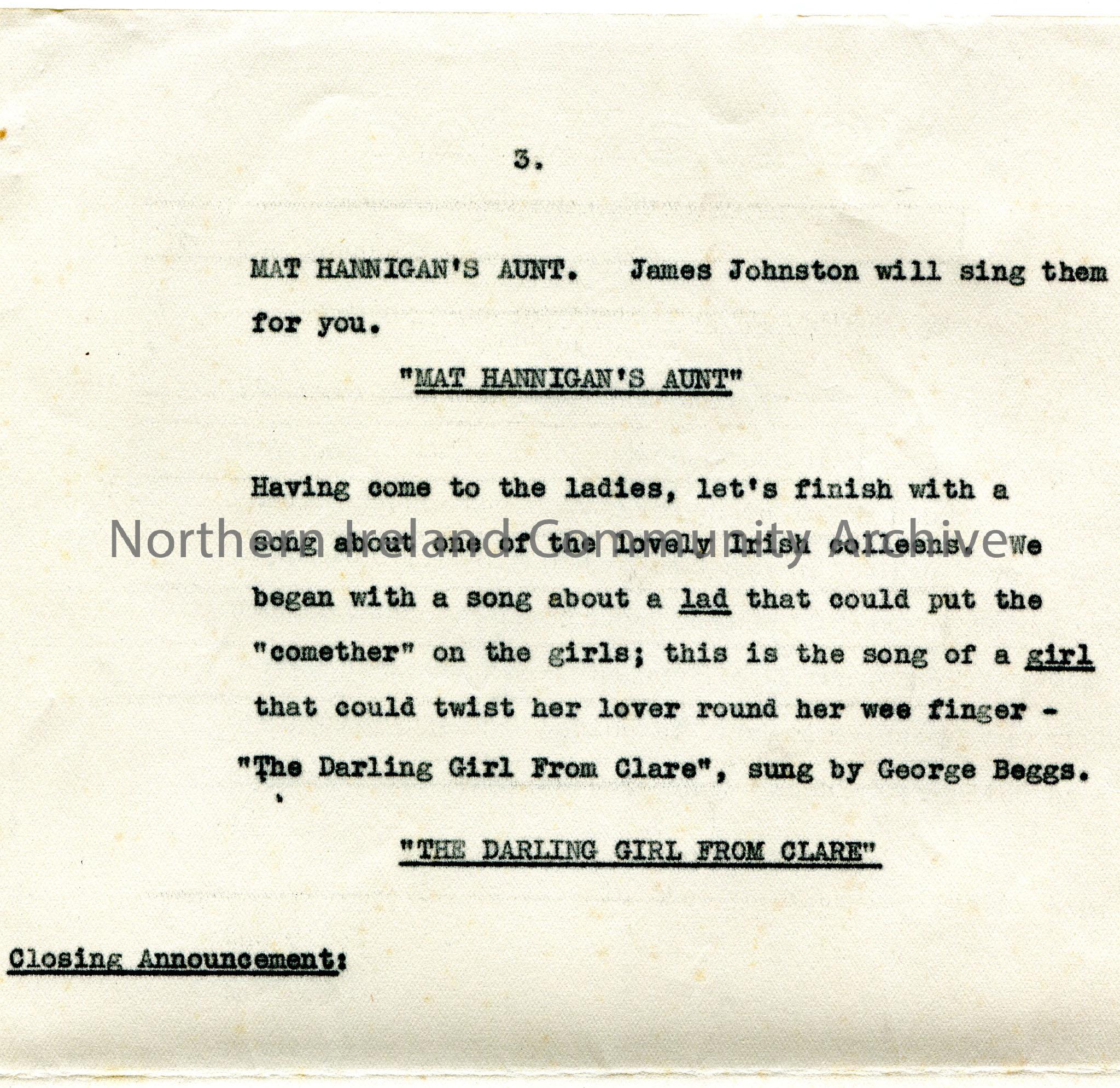 Page 3 of 3 of typed script for broadcast. Re Percy French Programme, The Forces Programme on Thursday 30th May, 1940 at 5.40-6.00pm. Script re Percy French's songs - Phil the Fluter's Ball, Larry Mick McGarry, Mick's hotel, The Emigrant's Letter, Are Ye Right There Michael, Are Ye Right?, Mat Hannigan's Aunt and The Darling Girl From Clare.