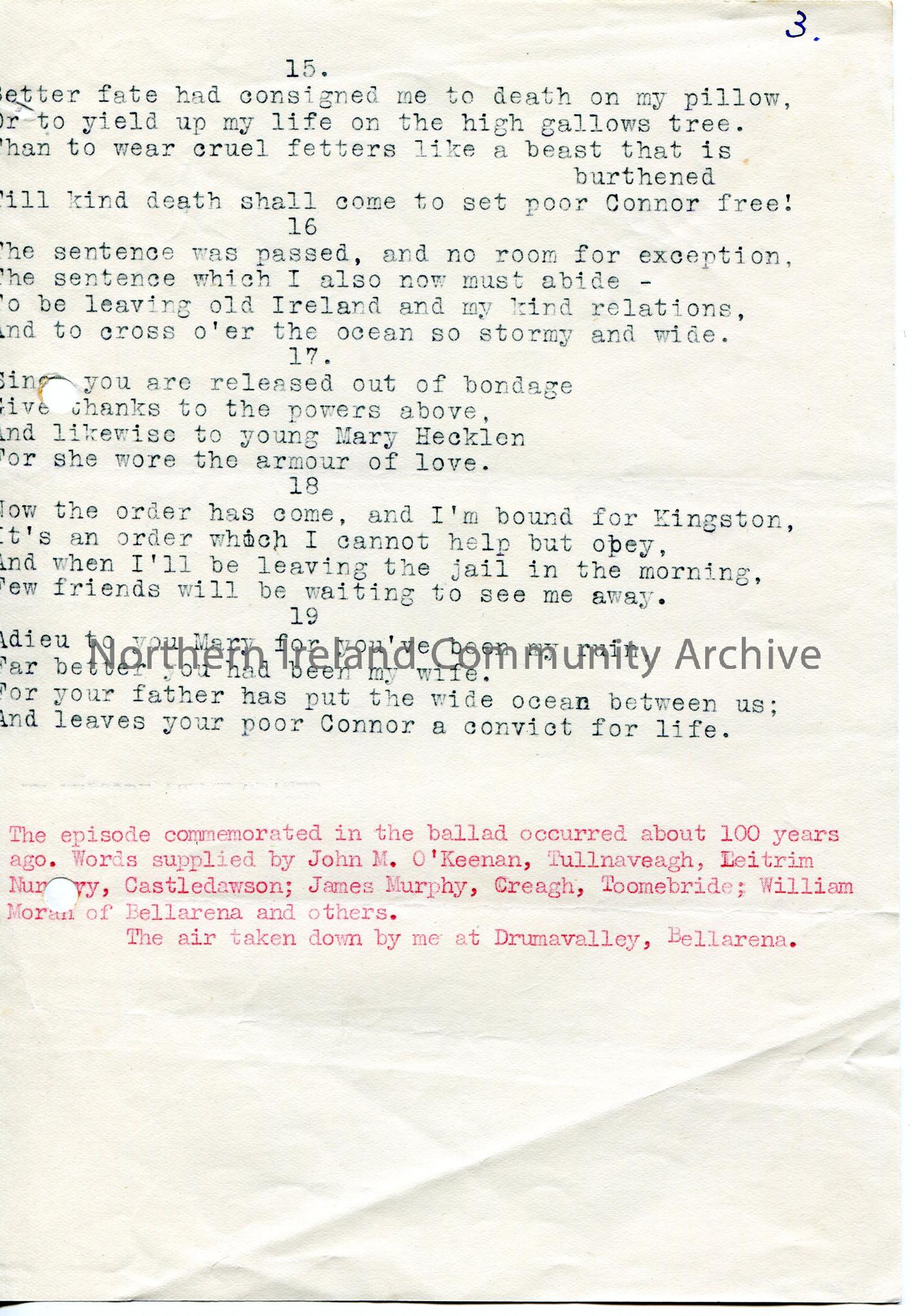 Page 3 of 3 of typed tonic sol-fa notation and words to song titled, 'Henry Connor'. Henry has been set up by his lover's father, has been found guilty and sent away to Kingston. Notes after the song state - words by John M O'Keenan, James Murphy and William Moran. 'Air taken down by me at Drumavalley, Bellarena'.