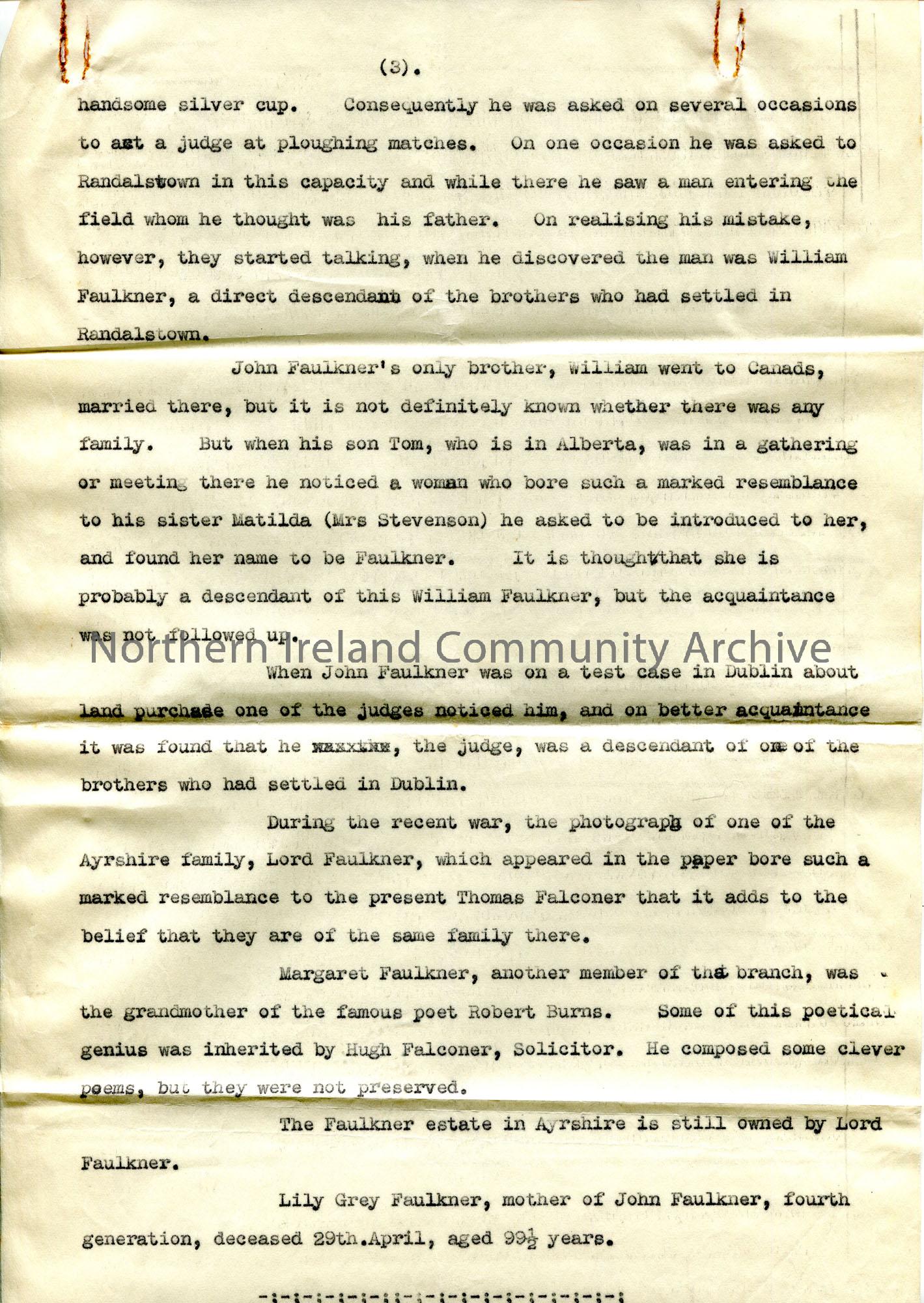 Page 3 of 3. Typed information re the Faulkner family. Mentions Randalstown, Kilrea, Ballymoney. Notes emigration of some family members to America an…