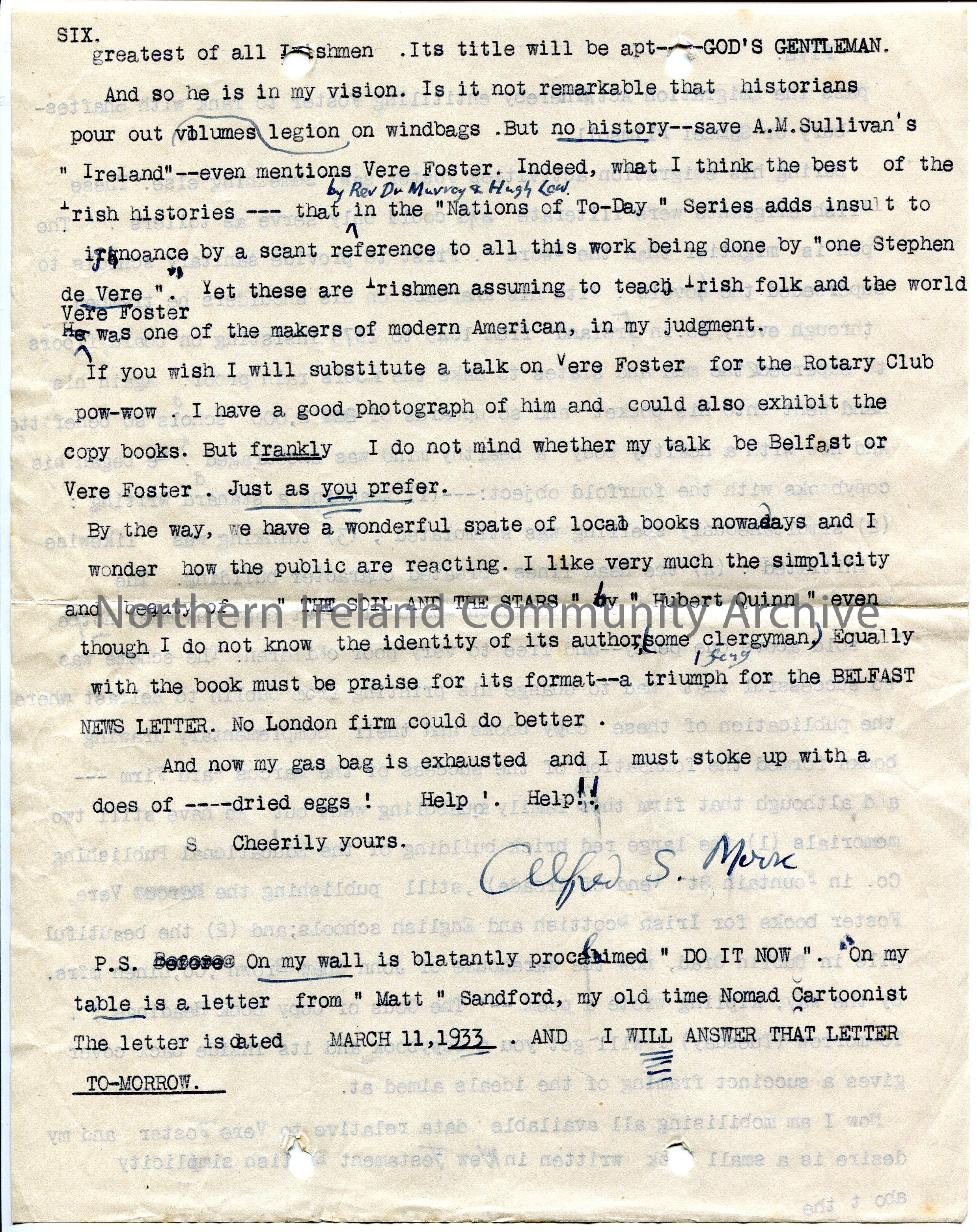 Page 3 of 3. Typed letter (double sided) to Sam Henry. Writing re Sam's request for information re Vere Foster. The writer is unsure whether to do a talk to the Rotary Club, Coleraine re Vere Foster or the origin of Belfast.