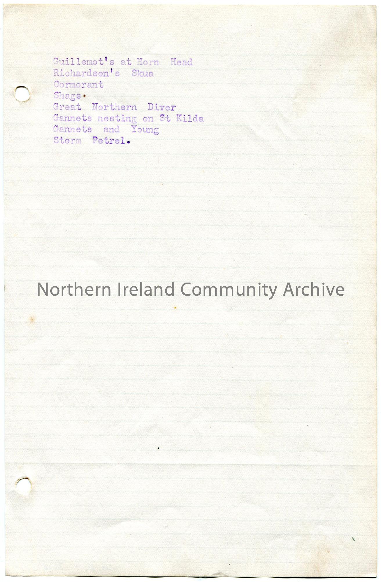 Page 3 of 3. Typed list of bird names – most likely of slides for a lecture or talk – in Portrush on 28th February 1922. Begins with Guillemot’s at Ho…