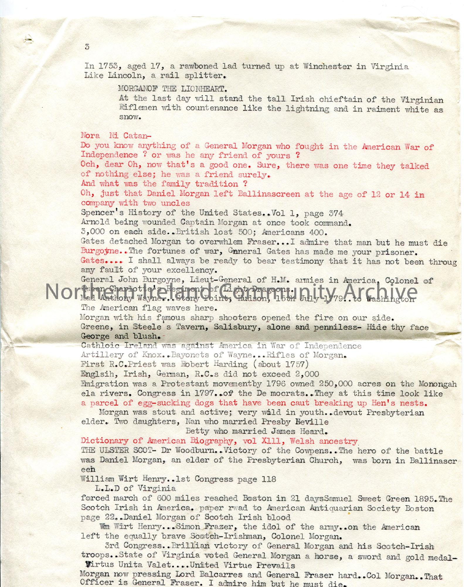 Page 3 of 3. Typed notes re General Daniel Morgan of America. Titled, 'Morgan of Moydamlaght. The Lion Heart'. There is a question mark over his place of birth which was thought to be Ballinascreen.