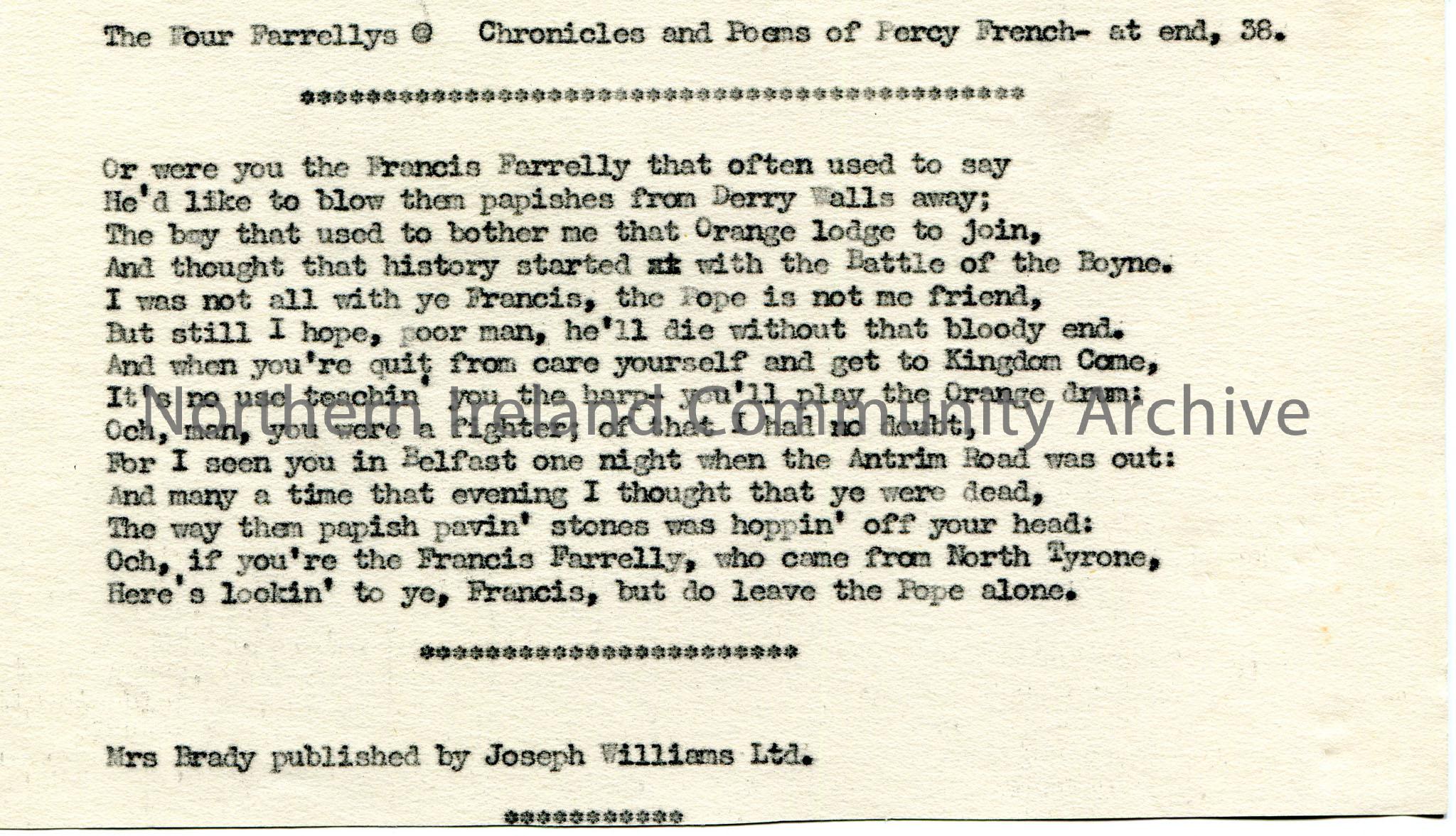 Page 3 of 3. Typed poem titled, ‘The Four Farrellys’, by William Percy French. Verse three. ‘Mrs Brady published by Joseph Williams Ltd’ typed at end …
