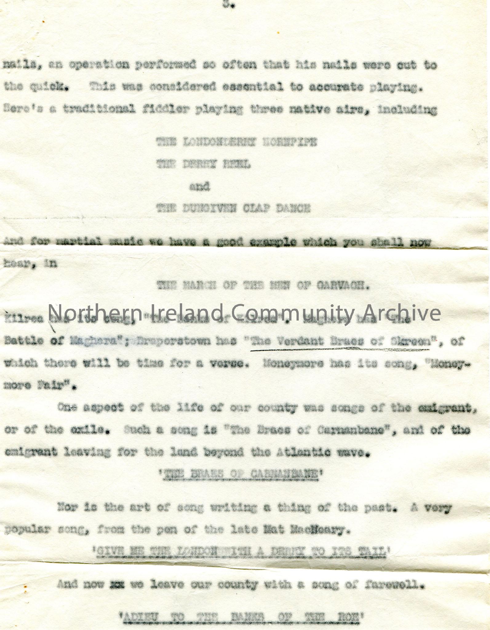 Page 3 of 3. Typed script for broadcast, N.Ireland contribution, on Saturday 25th January, 1941. Titled, ‘The Music of County Londonderry.’ Notes abou…