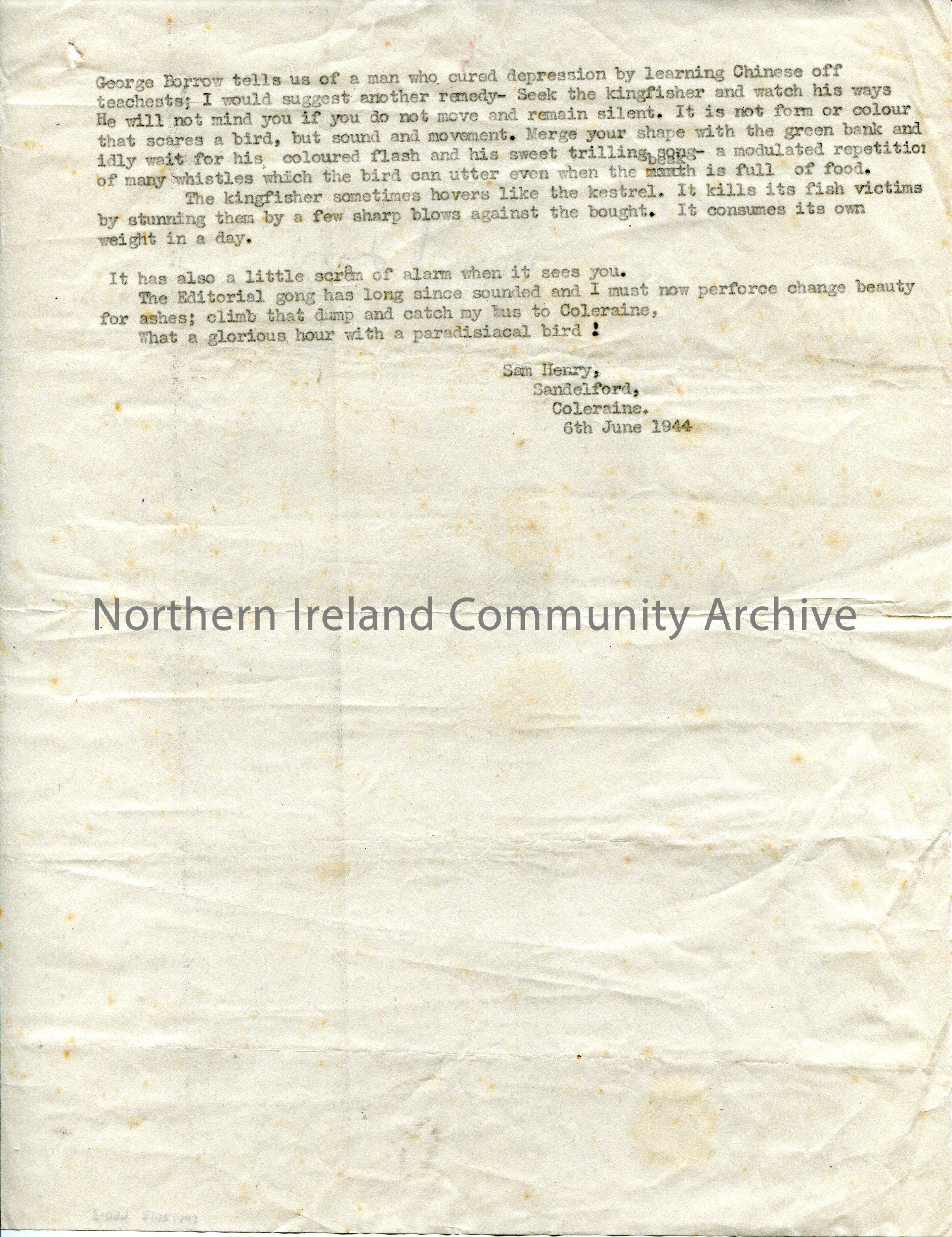 Page 3 of 3. Typed story by Sam Henry titled, ‘A Date with a Kingfisher’.