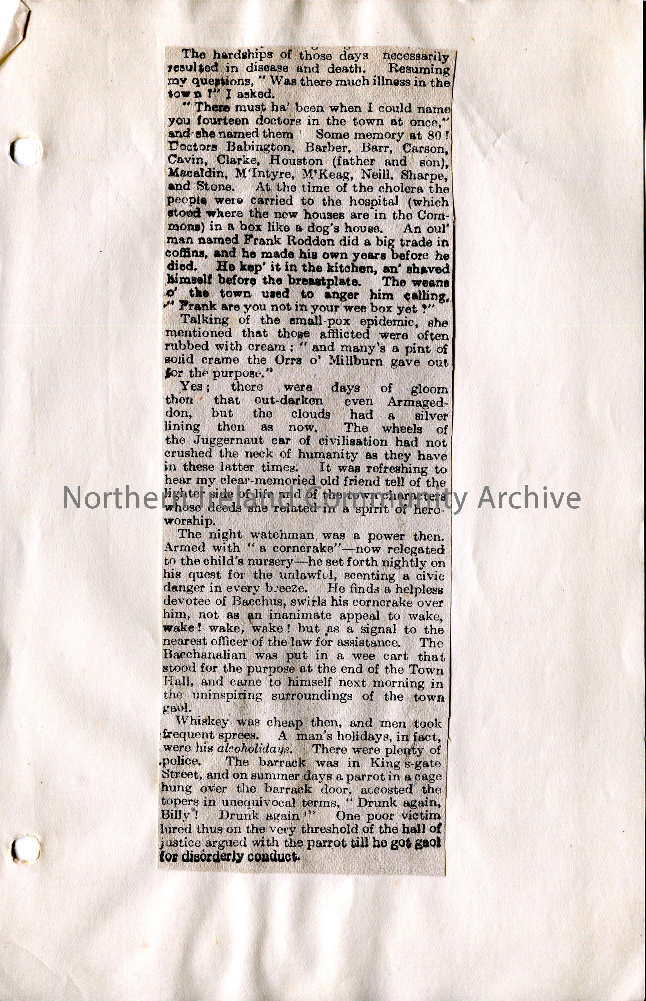 Page 3 of 4. Article cut from a newspaper titled, ' '47 And After. A Crack about the Oul' Times' by Sam Henry. Re a visit by Sam Henry to a woman in her 80s and of the 'stock of Macaskey'. Re the years of the famine and smallpox outbreaks in Coleraine. Refers to various places around the town.
