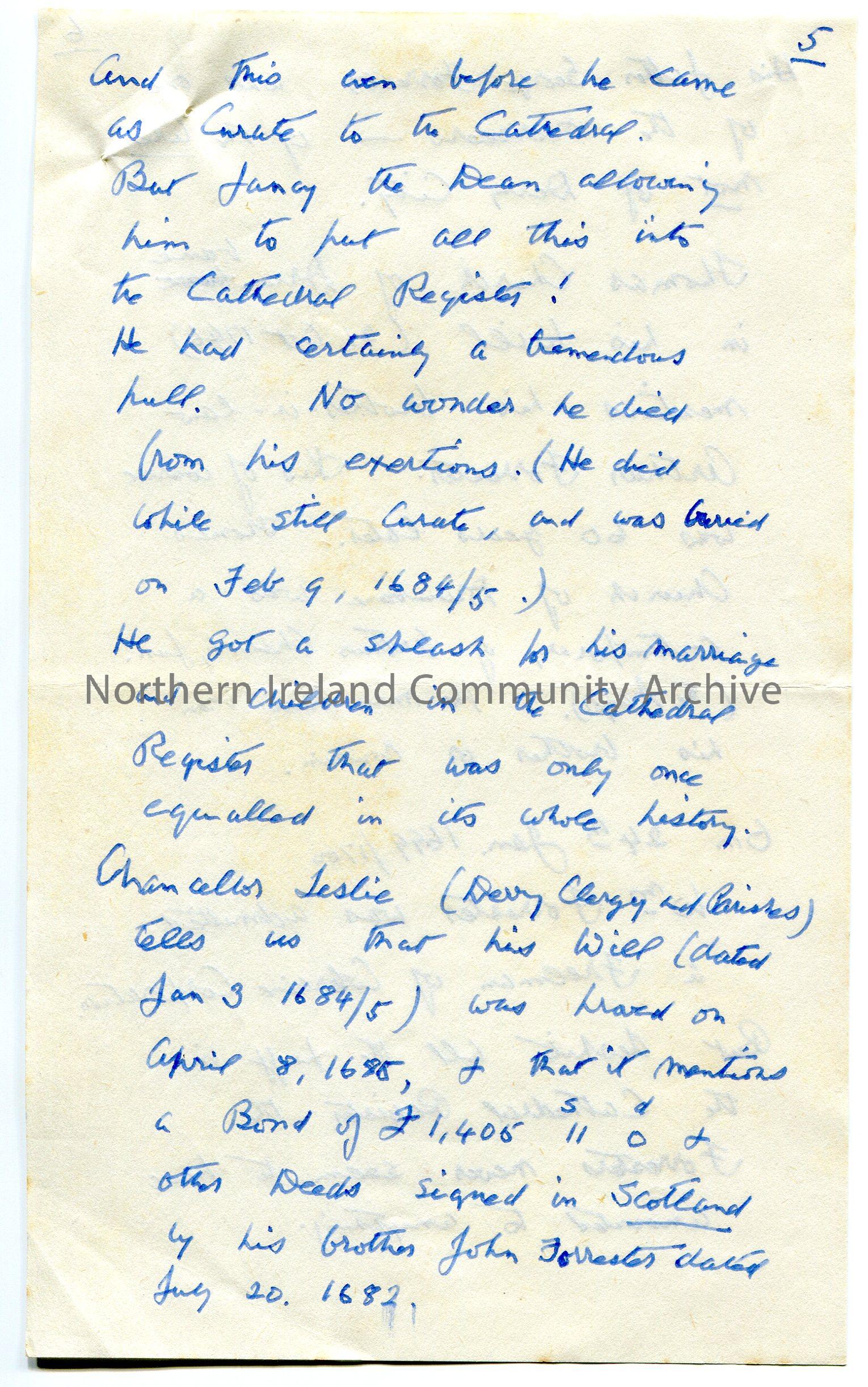 Page 3 of 4. Handwritten letter (double sided) to Mr Henry. Writes of Rev. Alexander Forrester and his time as Curate of Derry Cathedral 1679-1685. Wr…