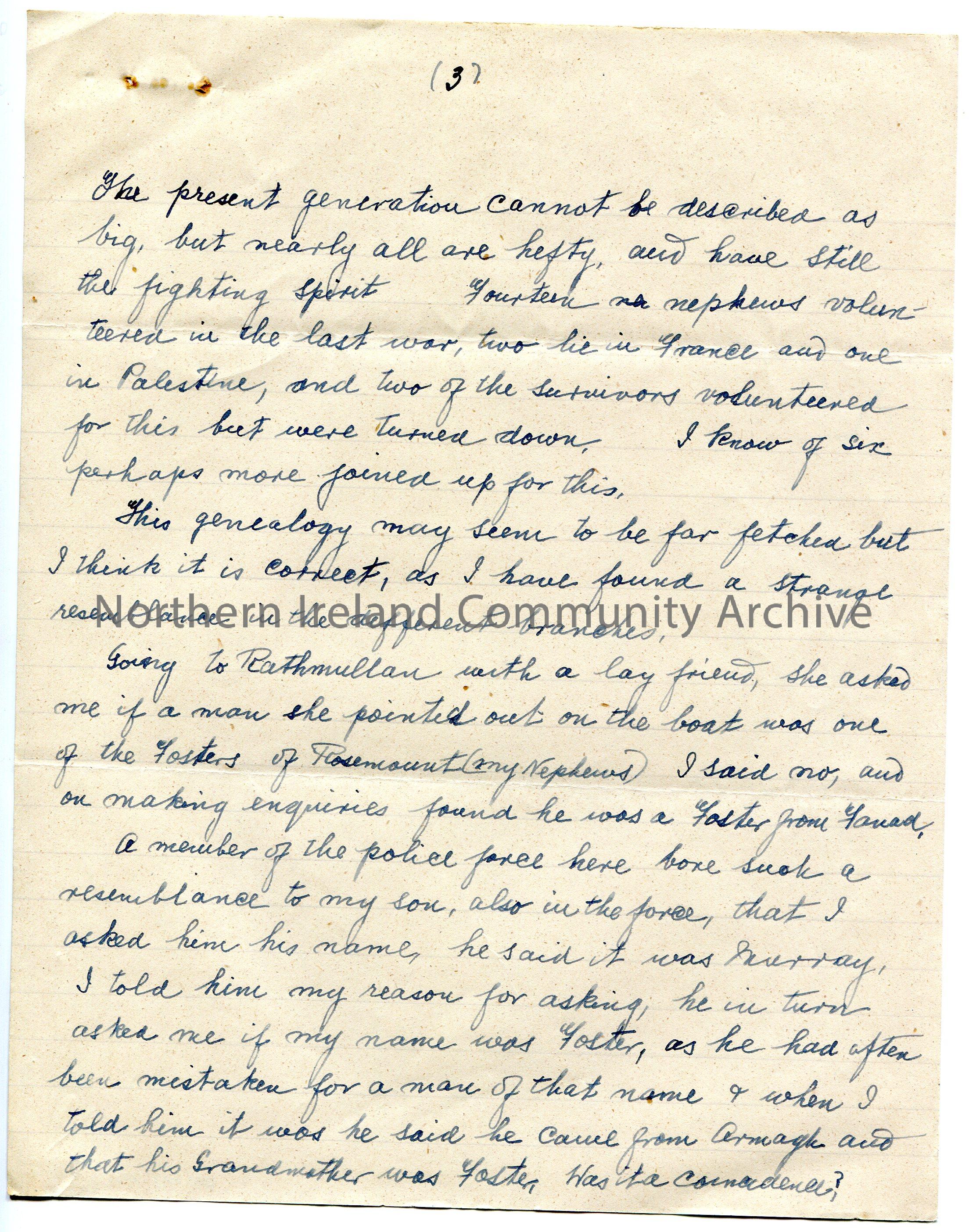 Page 3 of 4. Handwritten letter to Mr Henry. Responding to Sam’s request for information re Foster family, particularly ancestors of Stephen Foster th…