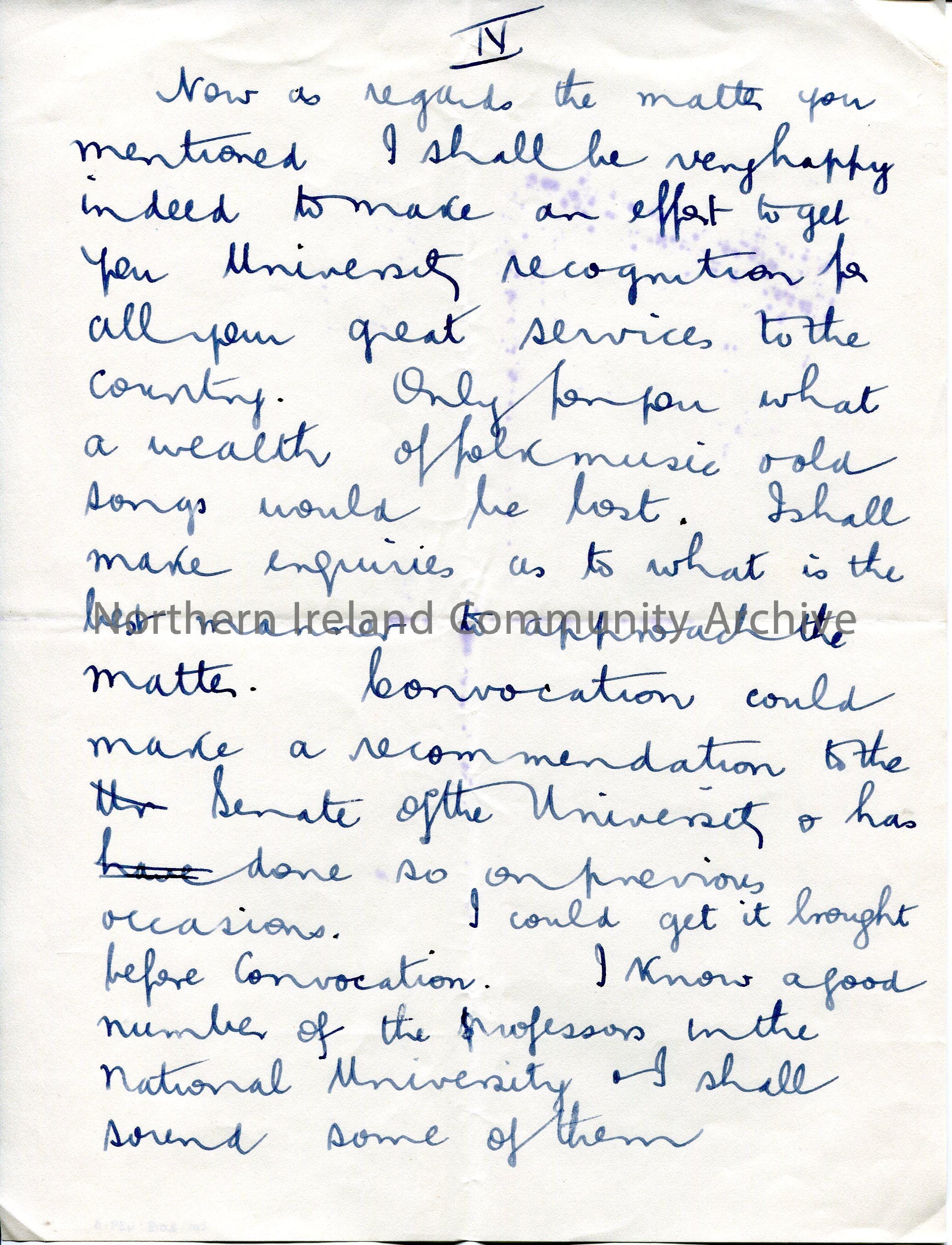 Page 3 of 4. Handwritten letter to Sam Henry. Writes re St. Patrick and Kilrea Church. Mentions an old custom of driving cattle between two fires on St. John's Eve. Sam has requested help from Mr Fitzpatrick to get recognised by the National University of Ireland for his services to the country.