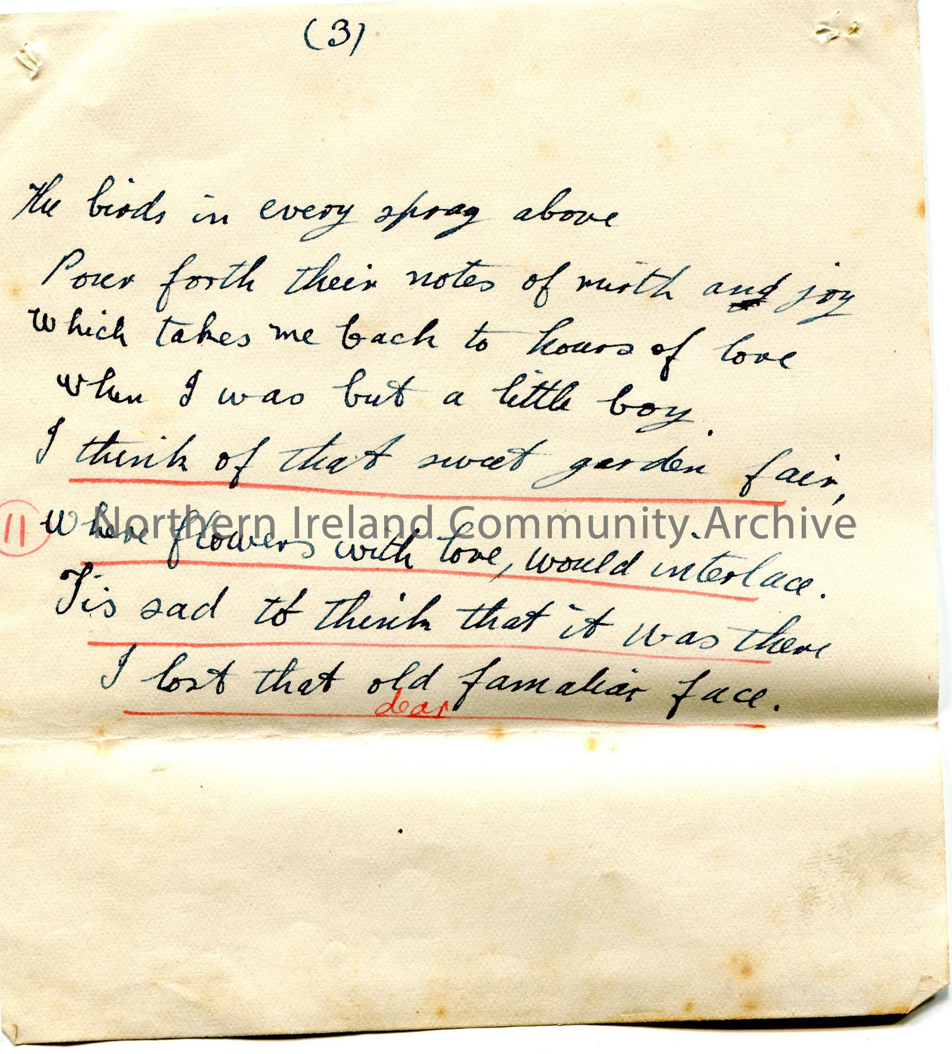 Page 3 of 4. Handwritten poem or words to song titled, ‘The Old Familiar Face’. Some lines are underlined in red with number ’11’ written beside it.