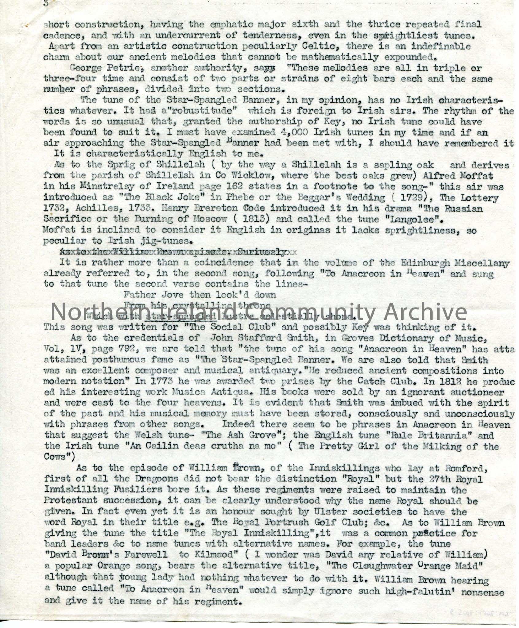 Page 3 of 4 of a copy of a typed letter to Mr Hill. Writing re the research by Sam into the origins of the 'Star Spangled Banner'. Sam believes that John Stafford Smith, 'composer and musical antiquary', was the composer.