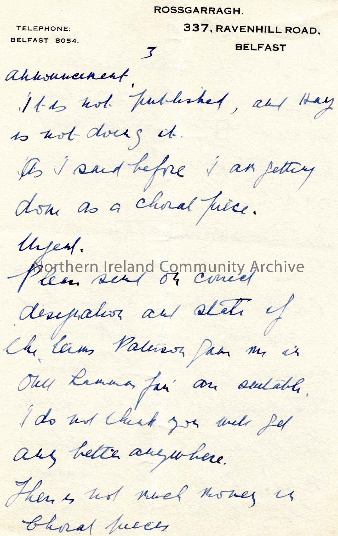 Page 3 of 4 of a handwritten letter to Mr Henry. Writes re consulting Sam before making arrangements with Paterson's Publications Ltd. He writes that he had asked Sam for the details of the Chimney Sweeper song which Sam may have overlooked. Suggests a separate agreement to be drawn up by Patersons. Mentions songs 'The Ould Lammas Fair', 'The Black Chimney Sweeper' and 'The Mountain Road'. Refers to John Macauley of Ballycastle and Dr Norman Hay.
