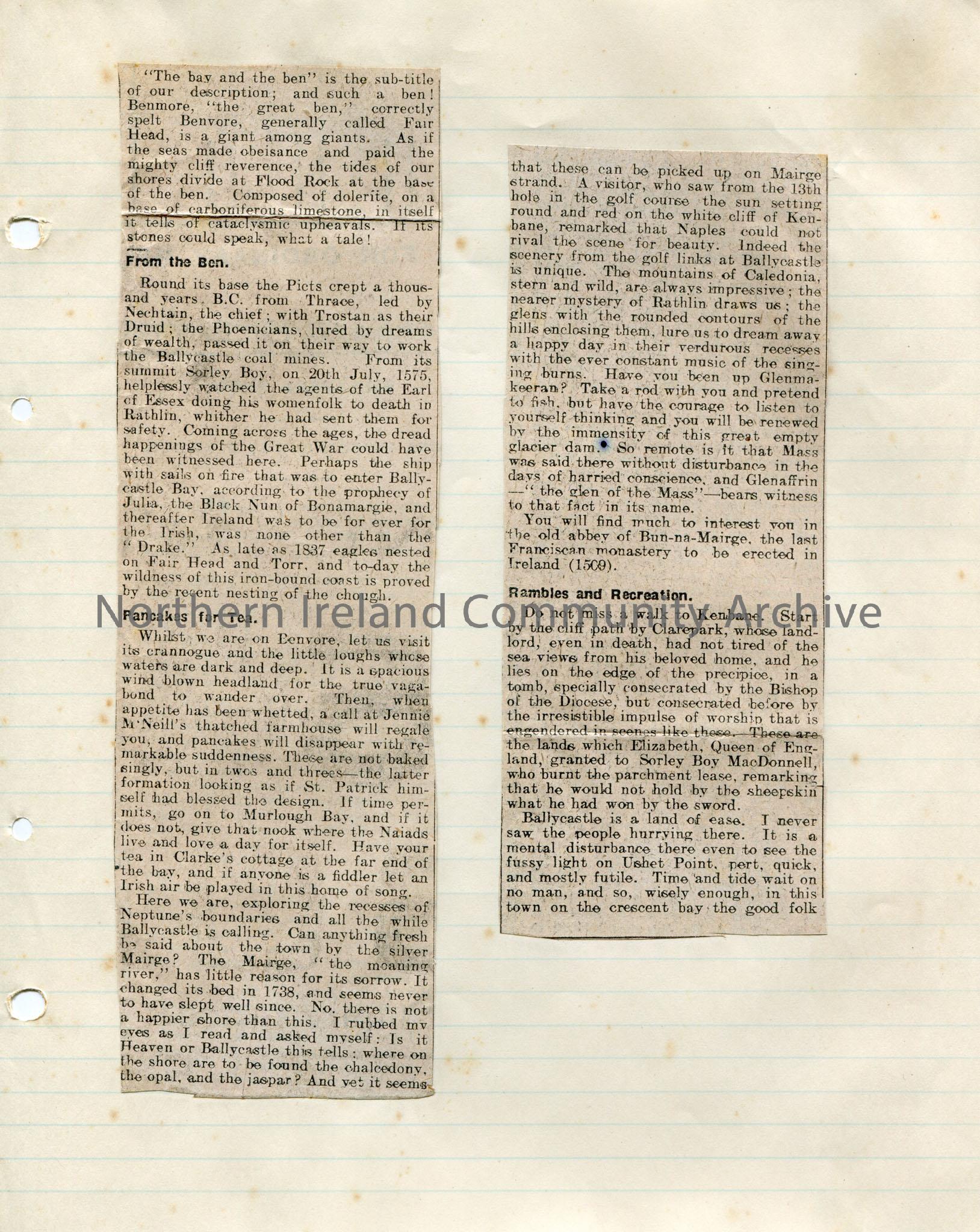 Page 3 of 4 of newspaper cuttings stuck to lined paper. Titled, ‘Between the Tides. Ballycastle: The Bay and the Ben,’ by Sam Henry. Re Rathlin and Ba…