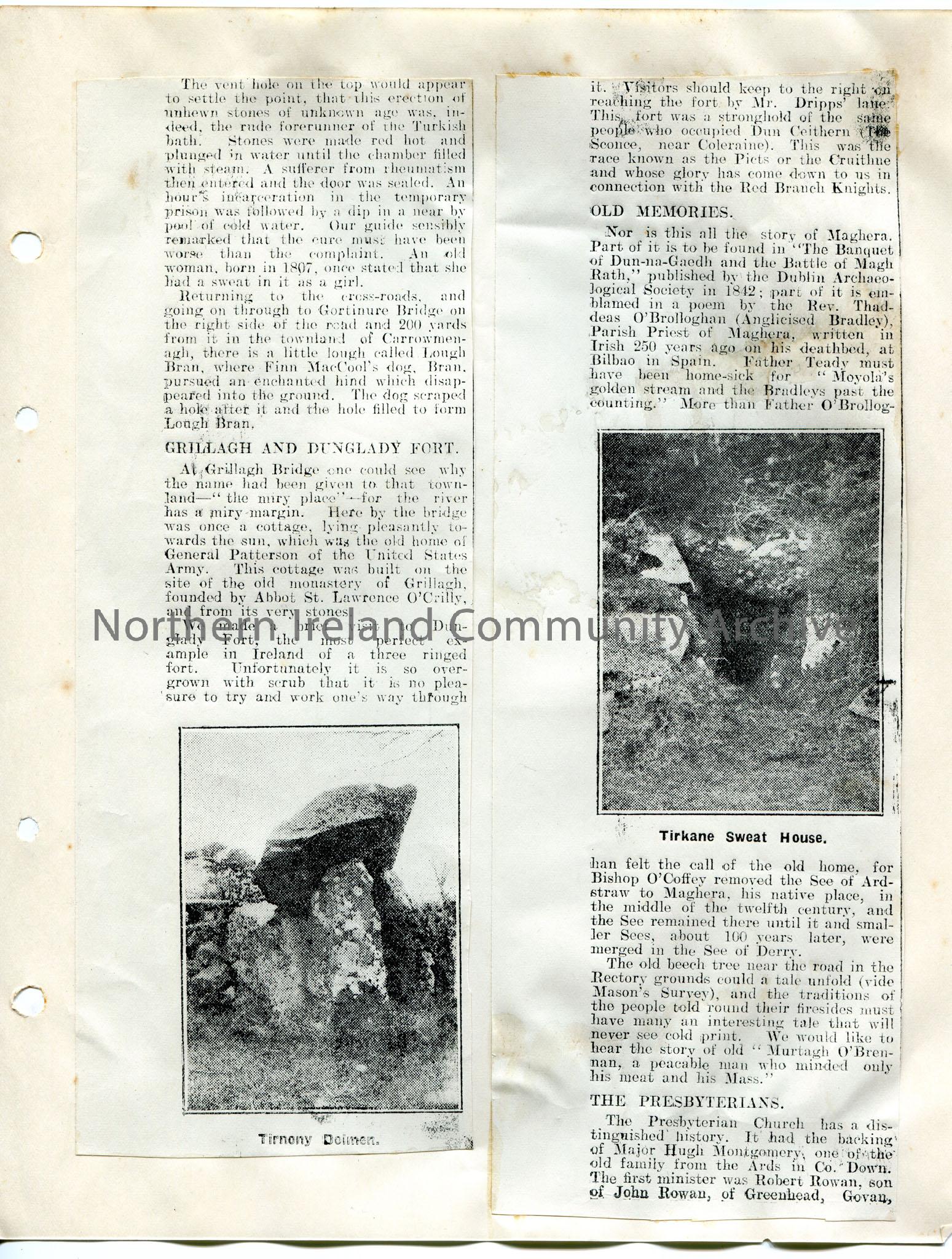 Page 3 of 4 of newspaper cuttings stuck to paper. Titled, 'In Search of Ulster. Maghera. In The Foothills of the Carntoghers.' Re history of the area. Mentions Largantogher, Grillagh bridge, Dunglady Fort, Maghera Presbyterian Church, Louis Walsh. Two photographic images captioned 'Tirnony Doimen' and 'Tirkane Sweat House'.