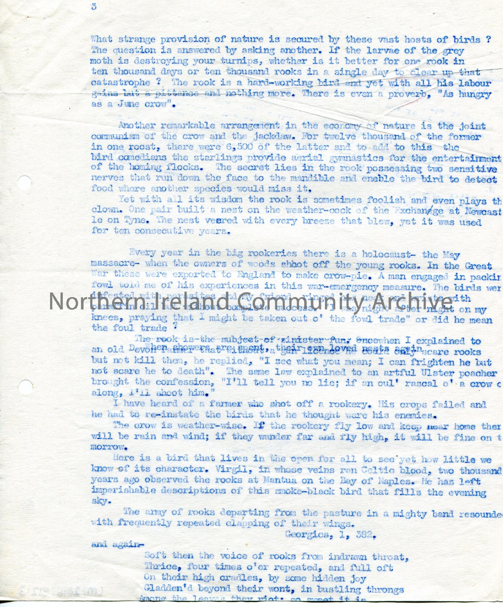 Page 3 of 4 of typed document by Sam Henry titled, "The Bird of Social Order". Document re the life of the crow or rook and its origins. Mentions possible roosting place of the birds as Crow Hill, Somerset, Coleraine.