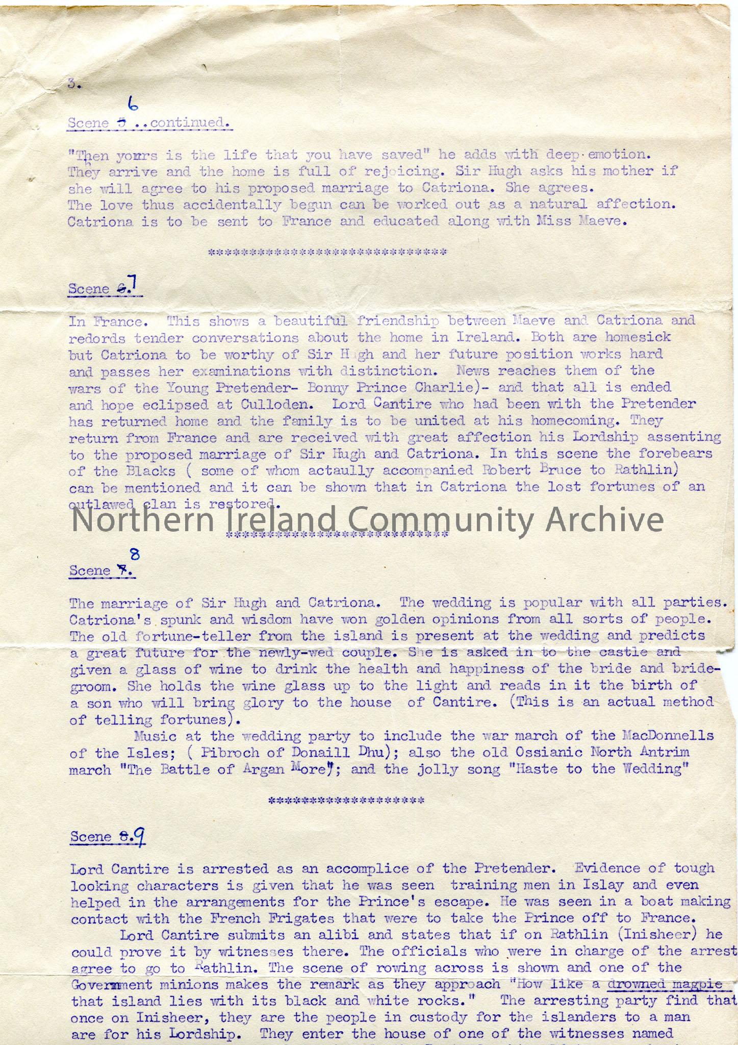 Page 3 of 4 of typed script titled, "Drowned Magpie: A Romance of Inisheer. Alternative title:- Lady Goose-Girl". Re Catriona, Lady Cantire, Sir Hugh. Script to include songs- "Ho Ro, My Nut-Brown Maiden", the Rathlin Island boat song; "The Enchanted Horse"; Luke Aylmer Connolly's song "To Rathlin Isle". 12 scenes. 'Sam Henry 6 June 1938' and 'Sandelford Coleraine 10?/1/42' written on last page.
