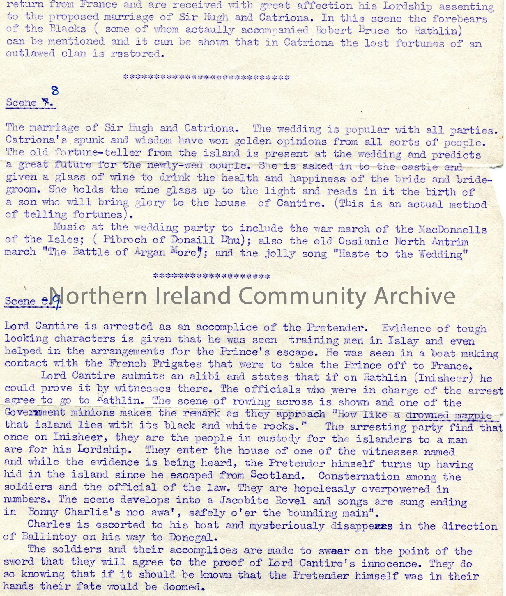 Page 3 of 4 of typed script titled, "Drowned Magpie: A Romance of Inisheer. Alternative title:- Lady Goose-Girl". Re Catriona, Lady Cantire, Sir Hugh. Script to include songs- "Ho Ro, My Nut-Brown Maiden", the Rathlin Island boat song; "The Enchanted Horse"; Luke Aylmer Connolly's song "To Rathlin Isle". 12 scenes. 'Sam Henry 6 June 1938' and 'Sandelford Coleraine 10?/1/42' written on last page.