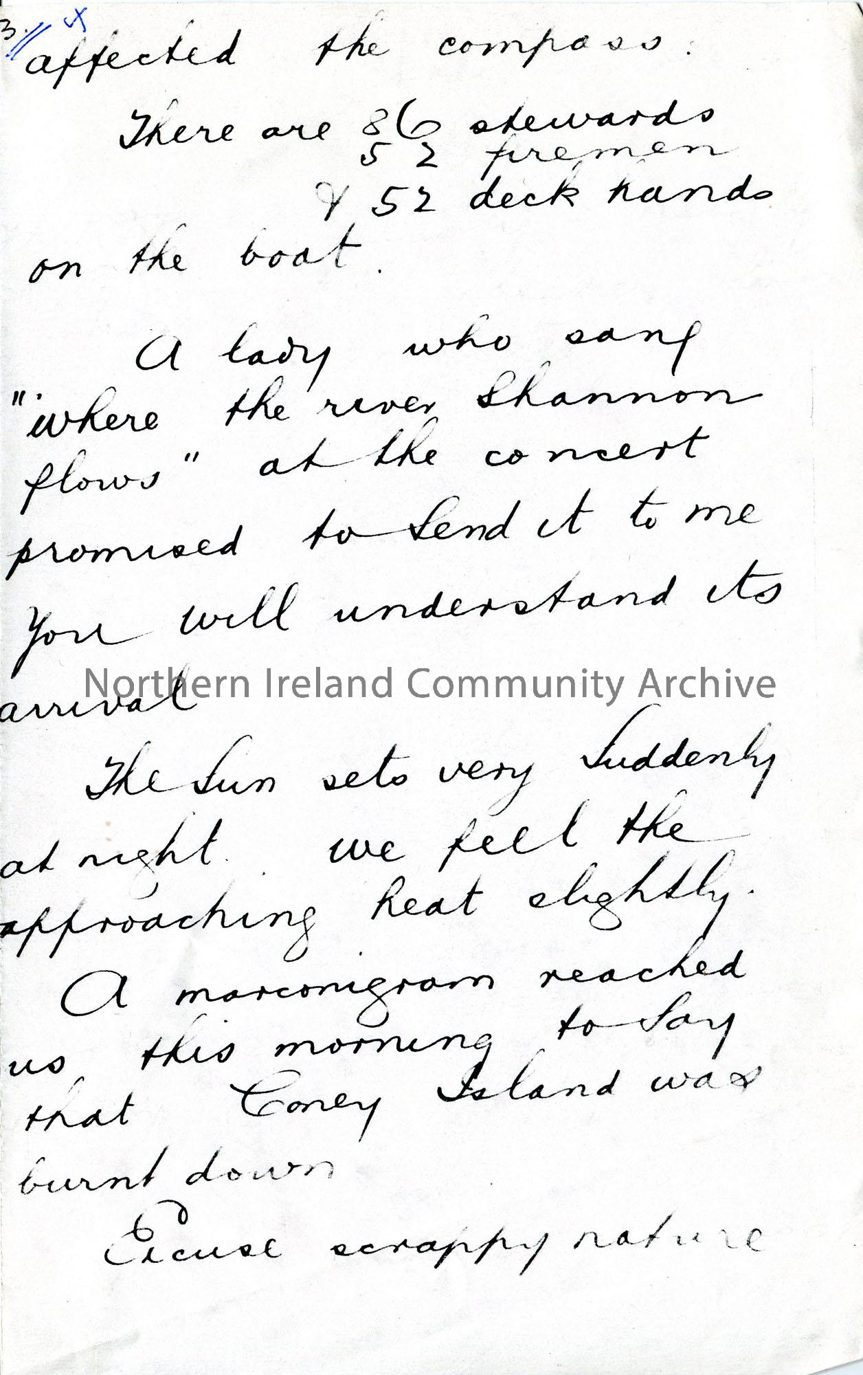 Page 3 of 4. Photocopy of a letter from Sam Henry. Writing on board S S Furnessia. Sam is travelling with his Uncle John from Moville to New York. Writes of his time on board the ship and that he heard via marconigram that Coney Island has burnt down.