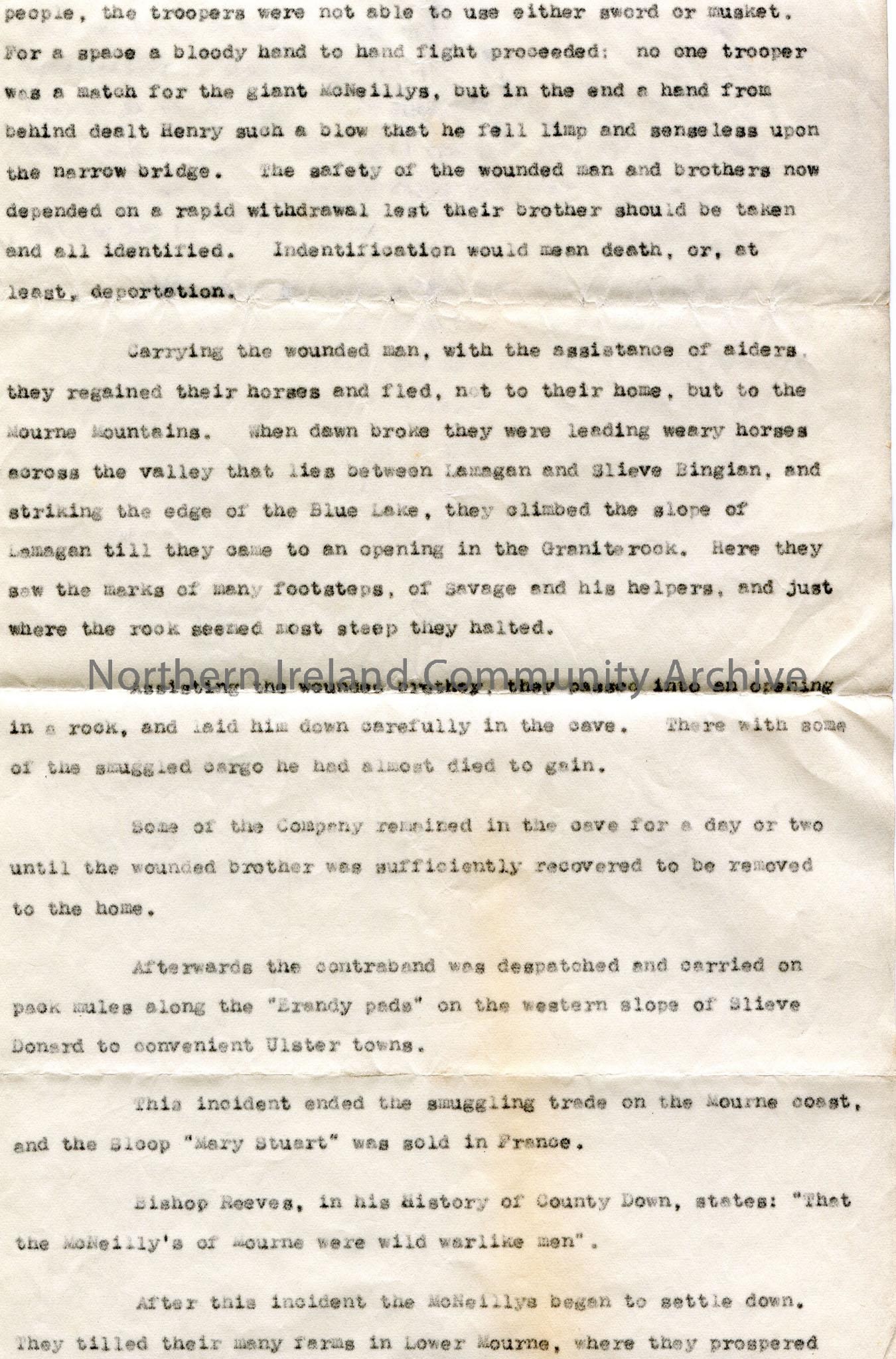 Page 3 of 4 typed document from the Newry Telegraph newspaper, dated 1931. Titled, 'The Last Voyage of the "Mary Stuart" to Mourne Waters'. By Robert Boyd, Kilkeel. Story re 'the old days in Mourne'.