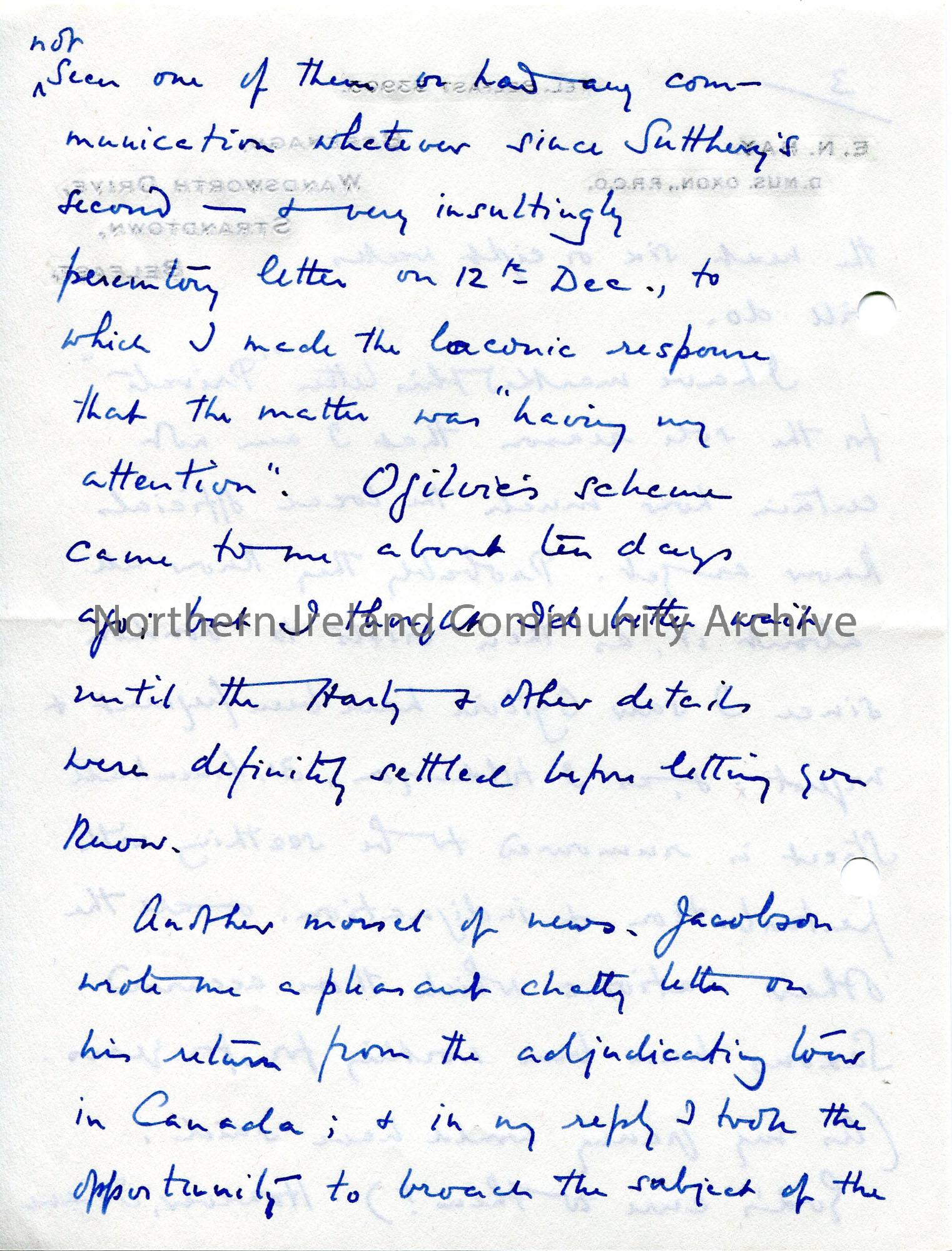 Page 3 of 5. Handwritten letter (first four pages double sided) to Sam Henry. Marked as private. Writing re the reconstitution of the Airs of Ulster s… – scan054f
