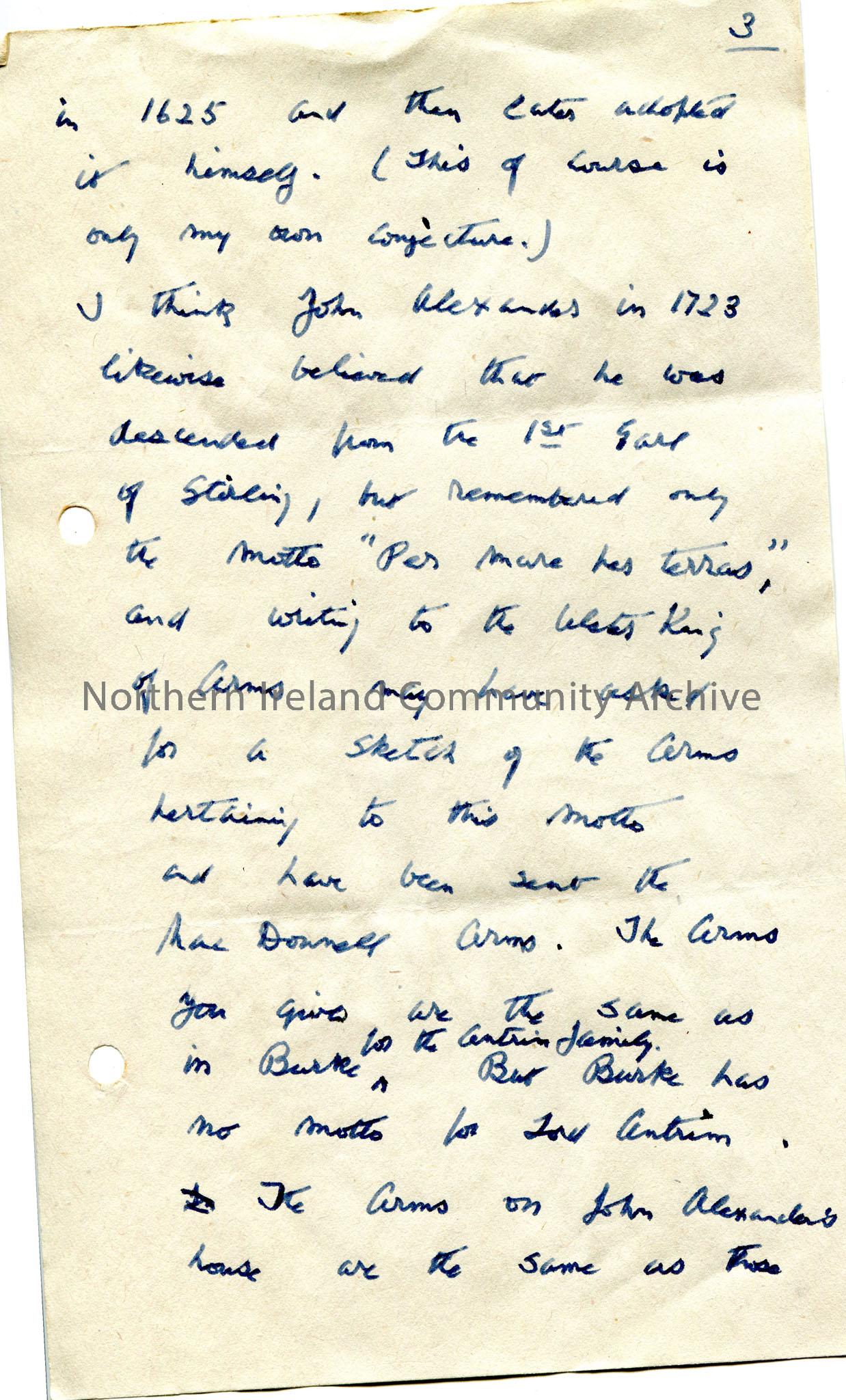 Page 3 of 5. Handwritten letter to Mr Henry. Congratulates Sam on his 'Dunluce and Giant's Causeway' booklet. Discusses his interest in the MacDonnell Arms and Antrim Arms. Mentions John Alexander of Limavady. Writes that he is interested in the 'Earls of Ulster' article in the R.S.A.I Journal.
