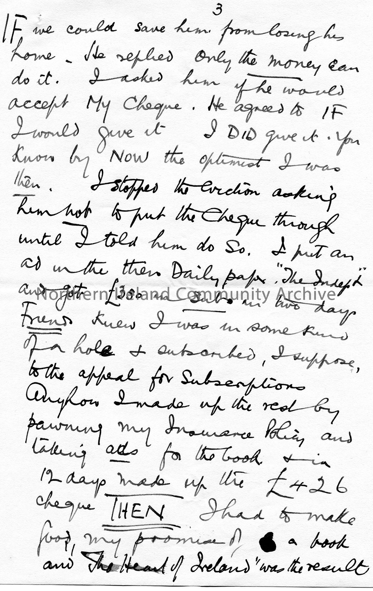 Page 3 of 5 of handwritten letter to Sam Henry, Sandelford, Coleraine. Several words are underlined or written in upper-case. Writing re the claim tha…