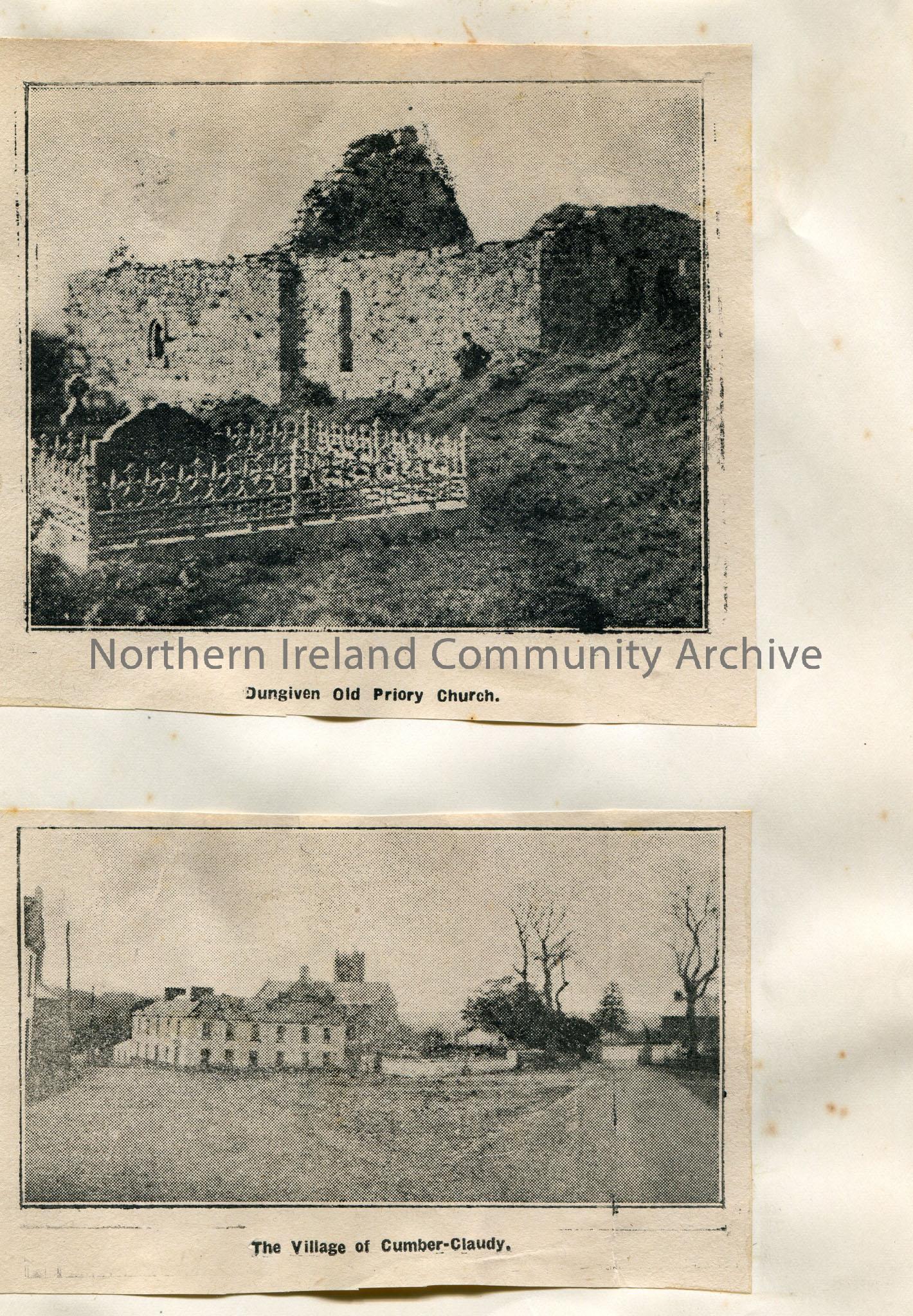 Page 3 of 5 of newspaper cuttings stuck to paper. Titled, 'In Search of Ulster. Dungiven and Claudy. The Land of Little Rivers.' Re ramble through Claudy and Dungiven. Mentions the O'Cahans and songs of the Sperrins. Two photographic images titled, 'Dungiven Old Priory Church' and 'The Village of Cumber-Claudy.'