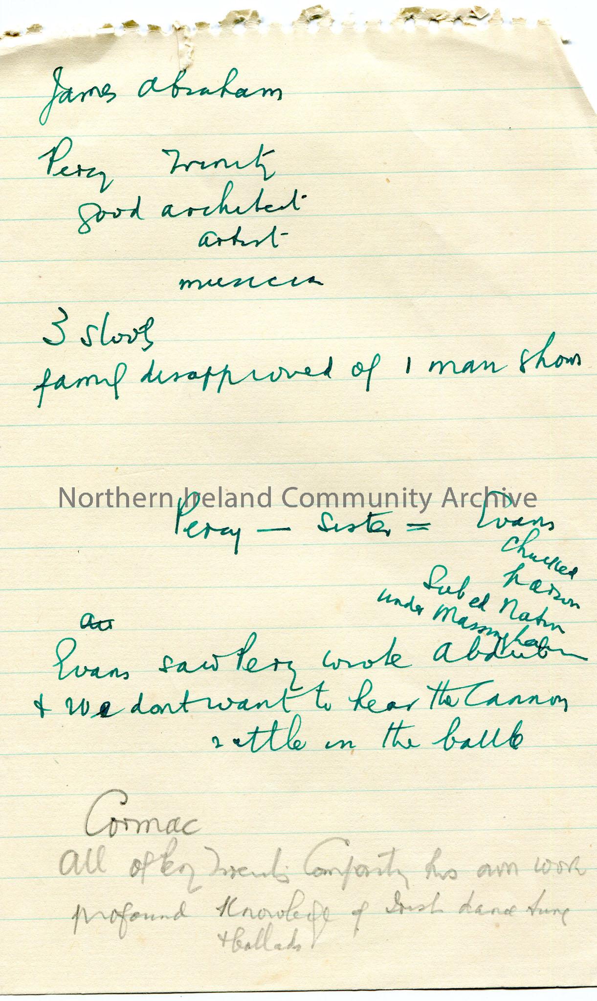 Page 3 of 5. Rough notes on lined paper re Percy French. Includes rough sketch of family tree and information from letters re Percy French, his life a…